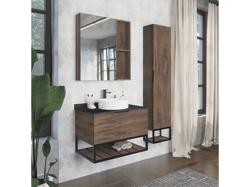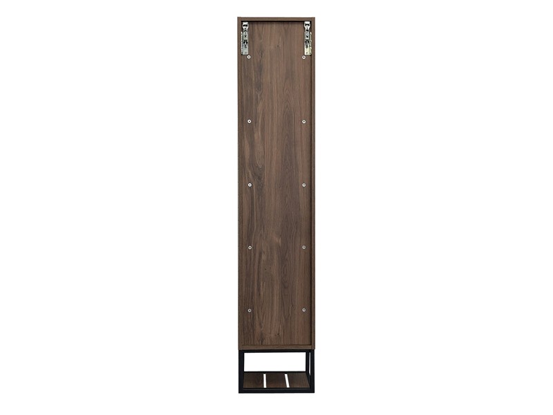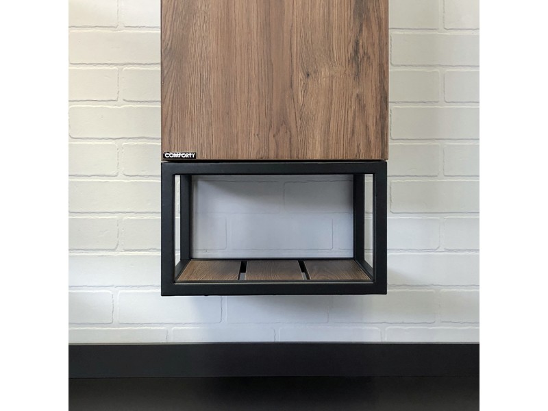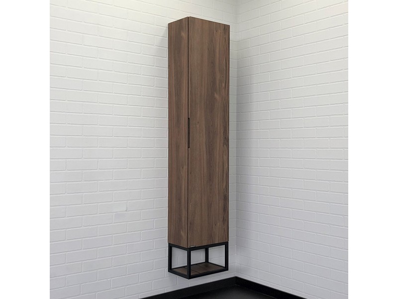 Подвесной шкаф - со створкой и пространством для открытого хранения. Фасад и корпус из влагостойкого ЛДСП. Пространство открытого хранения на основе - металлическая рама из окрашенного в черный цвет металла. Петли створки с механизмами плавного закрывания. Створка может быть подвешена с правым или левым расположением петель.