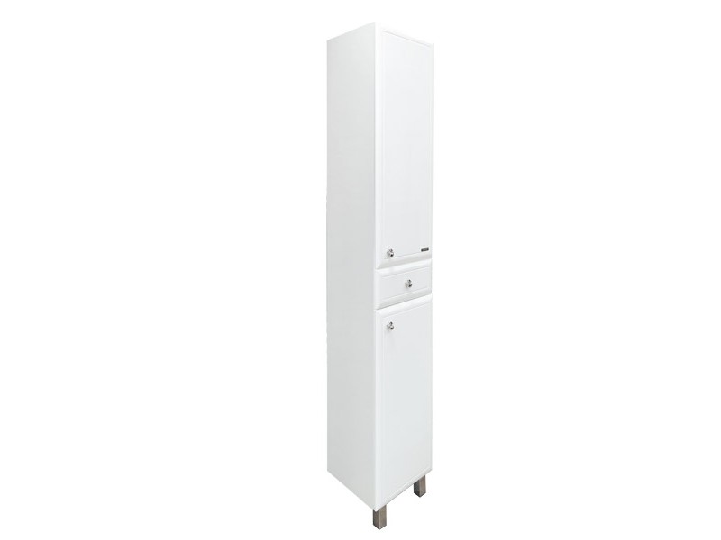 Шкаф-колонна с двумя створками и выкатным ящиком. Створки открываются вправо, оснащены петлями с плавным закрыванием. Фасады покрыты белой глянцевой эмалью.