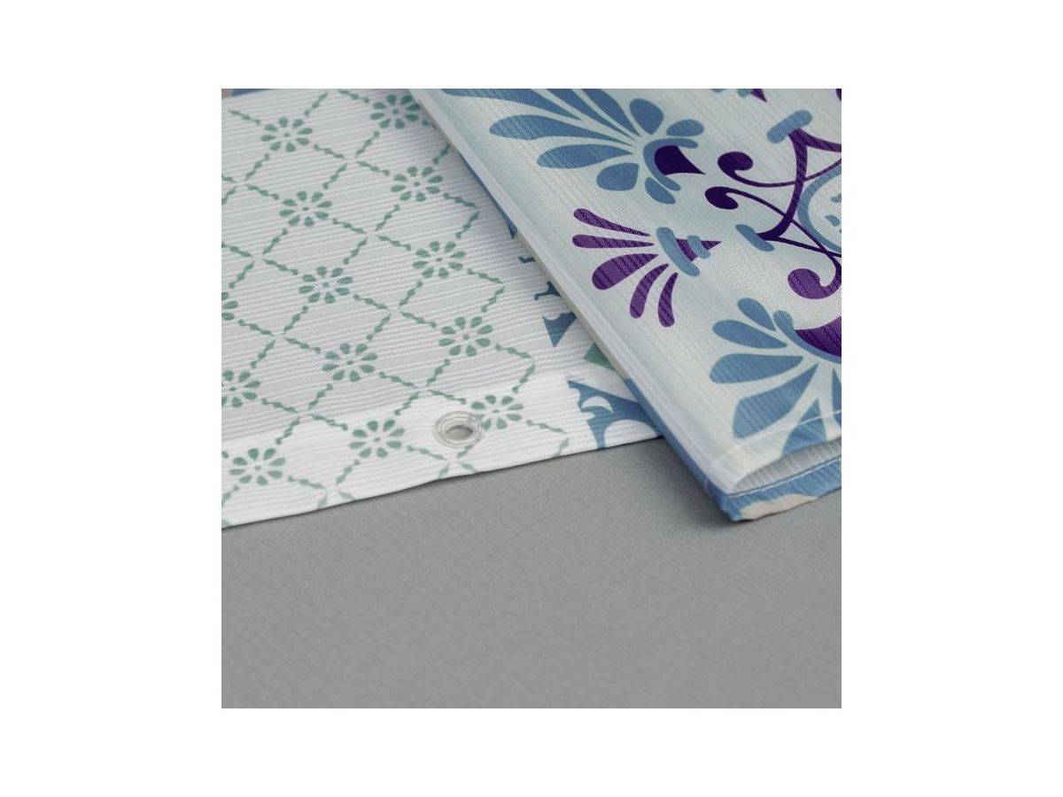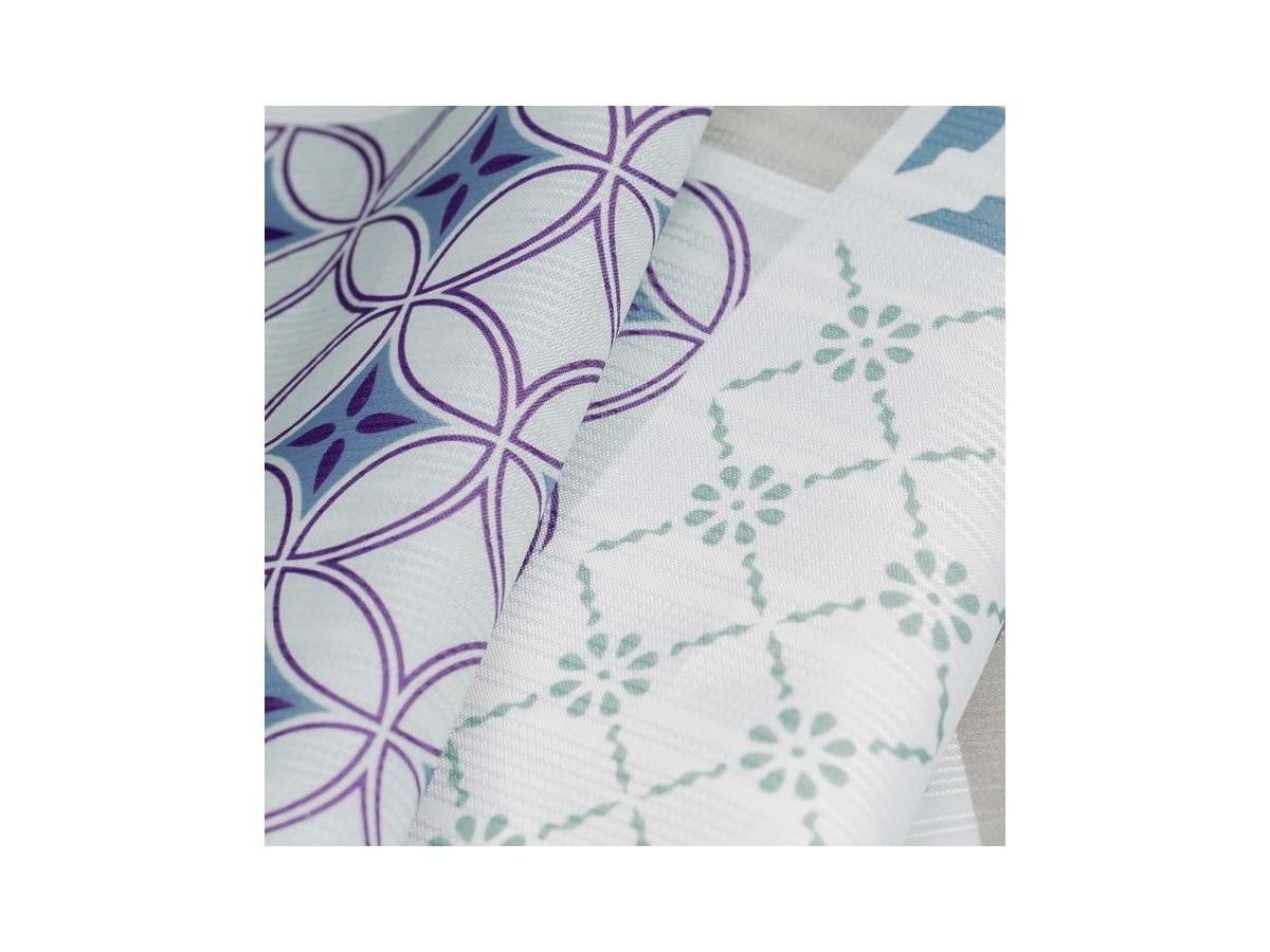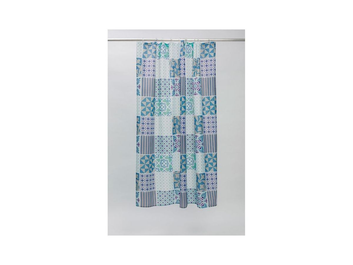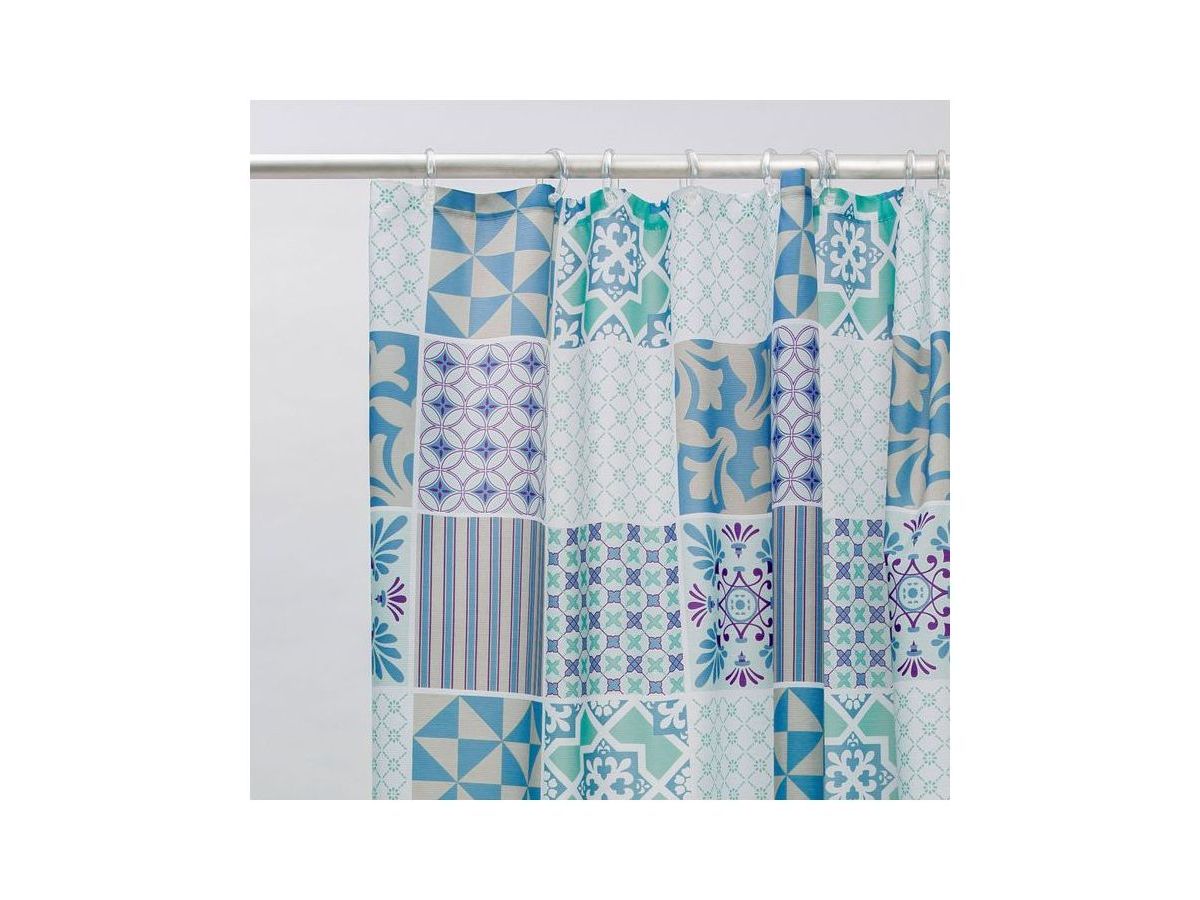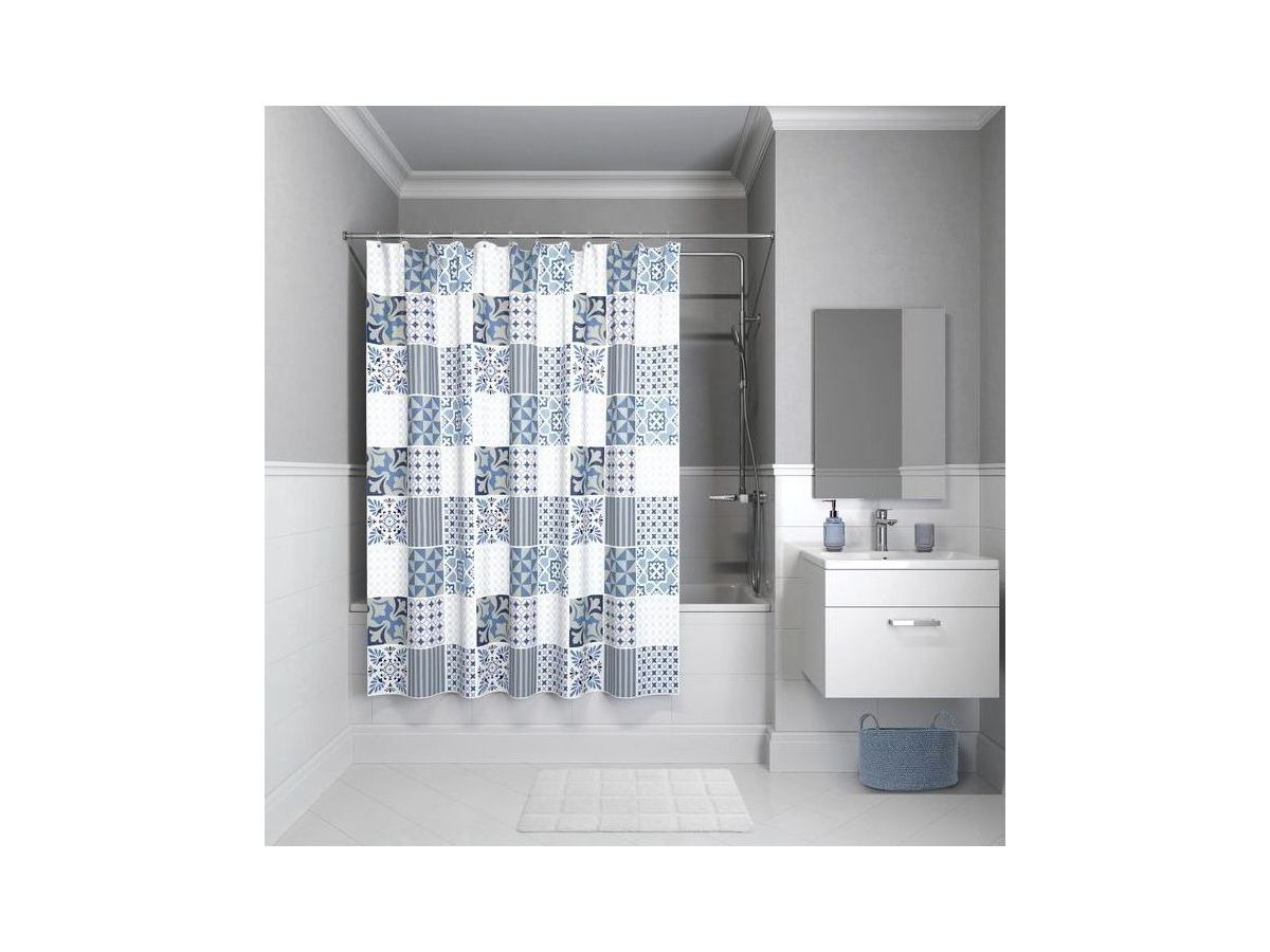 Непрозрачная штора для ванной с принтом в сине-фиолетовых тонах в духе техники шитья пэчворк. Штора изготовлена из полиэстера с ребристой фактурой в виде горизонтальных полос и деликатным блеском. Штора имеет утяжеляющую нить по нижнему краю, которая позволяет избежать задирания ткани, прозрачные пластиковые люверсы и кольца в форме буквы О из прозрачного пластика.