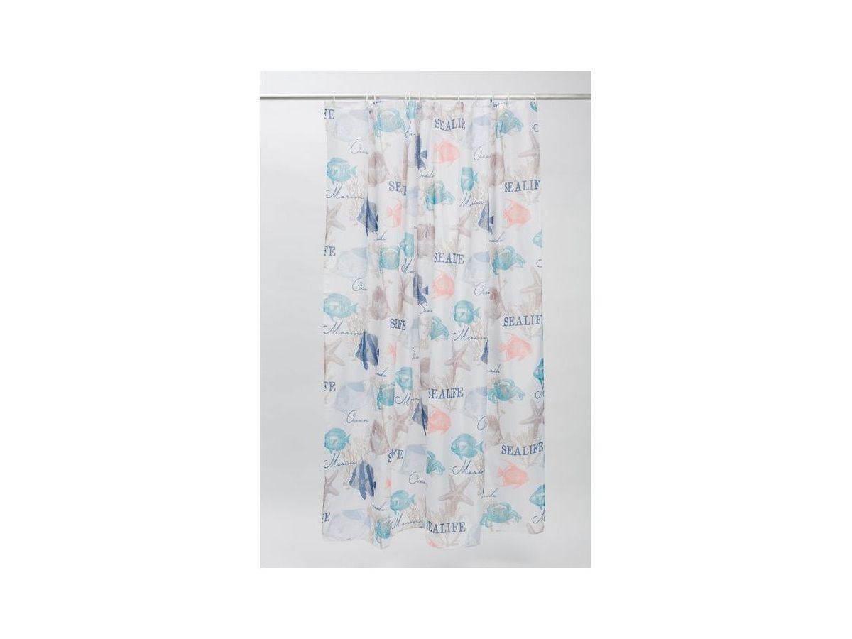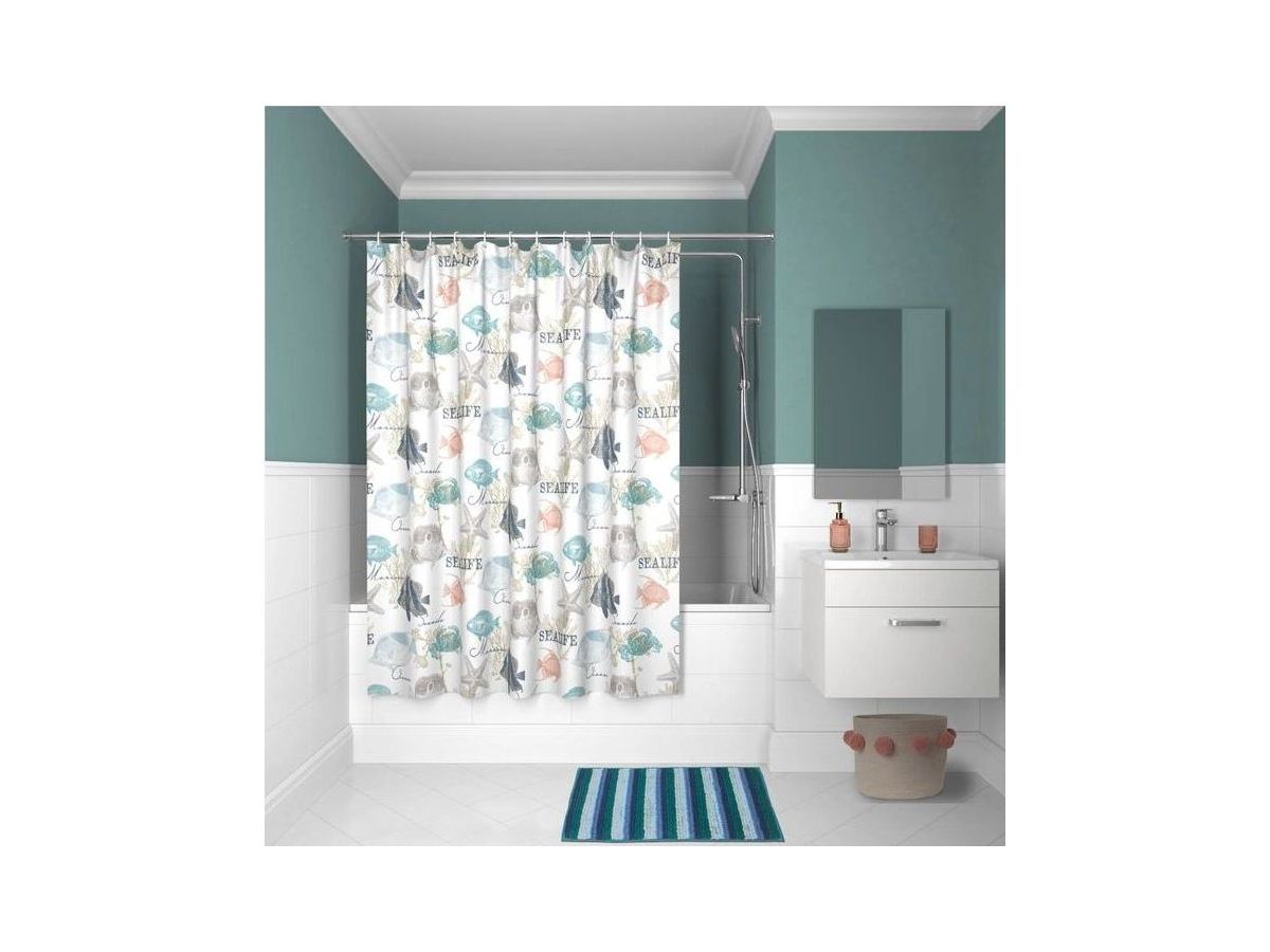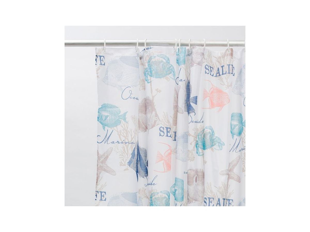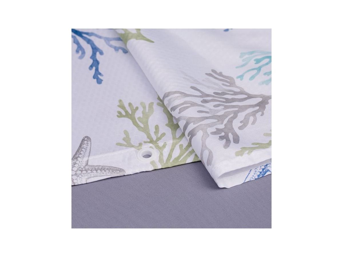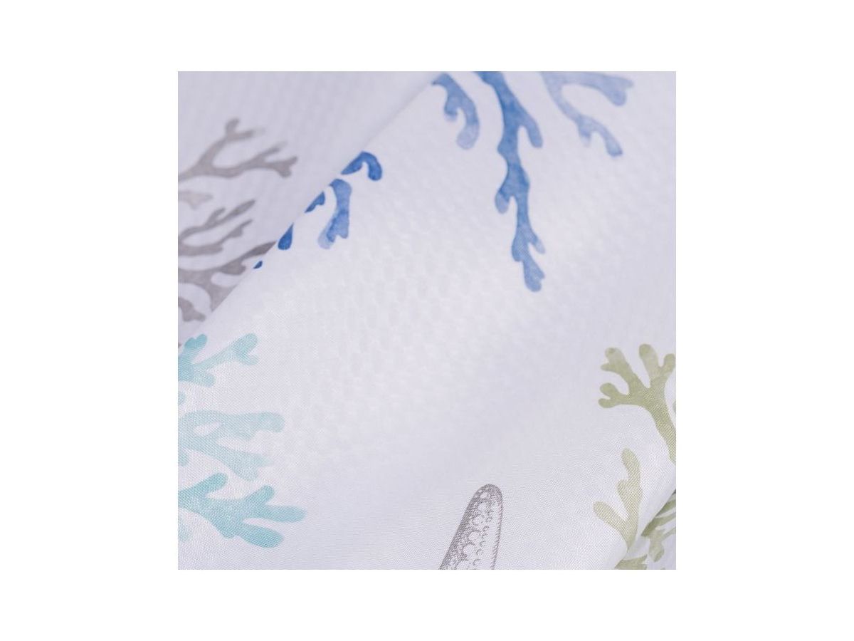 Непрозрачная штора для ванной с морским принтом в нежной пастельной расцветке. Штора изготовлена из полиэстера с красивой атласной текстурой и деликатным блеском. Штора имеет утяжеляющую нить по нижнему краю, которая позволяет избежать задирания ткани, хромированные металлические люверсы и кольца в форме буквы С из белого пластика.