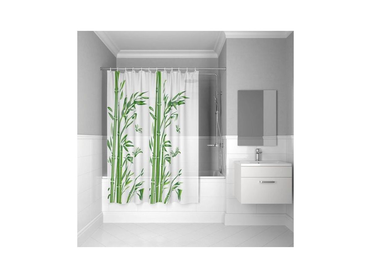 Штора для ванной с ярким принтом в азиатском стиле в виде бамбуковых ветвей станет отличной покупкой на дачу. Изготовлена из плотного матового материала PEVA с бархатистым покрытием soft touch, приятным на ощупь. Штора мягкая, тонкая, легкая, полупрозрачная, не шуршит. Штора имеет хромированные люверсы из нержавеющего материала; без колец в комплекте. Размер шторы: высота – 180 см, длина – 180 см.