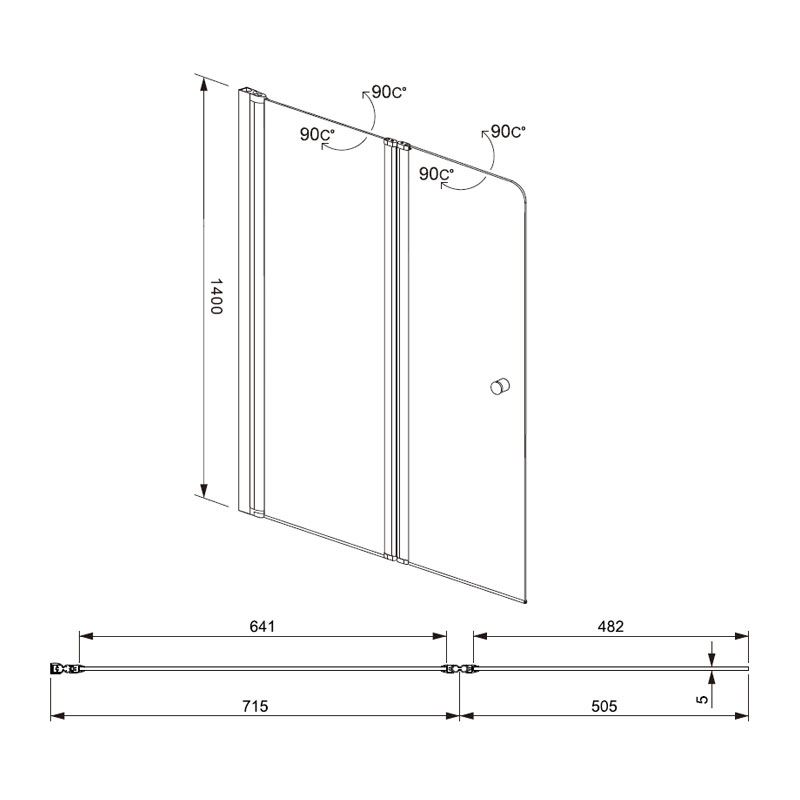Ширина изделия - 1220 мм, из которых неподвижная часть - 715 мм, дверца - 505 мм. Для изготовления шторки использовано пятимиллиметровое прозрачное закаленное стекло с современным механизмом открывания распашной дверцы, который гарантирует удобство и надежность использования.