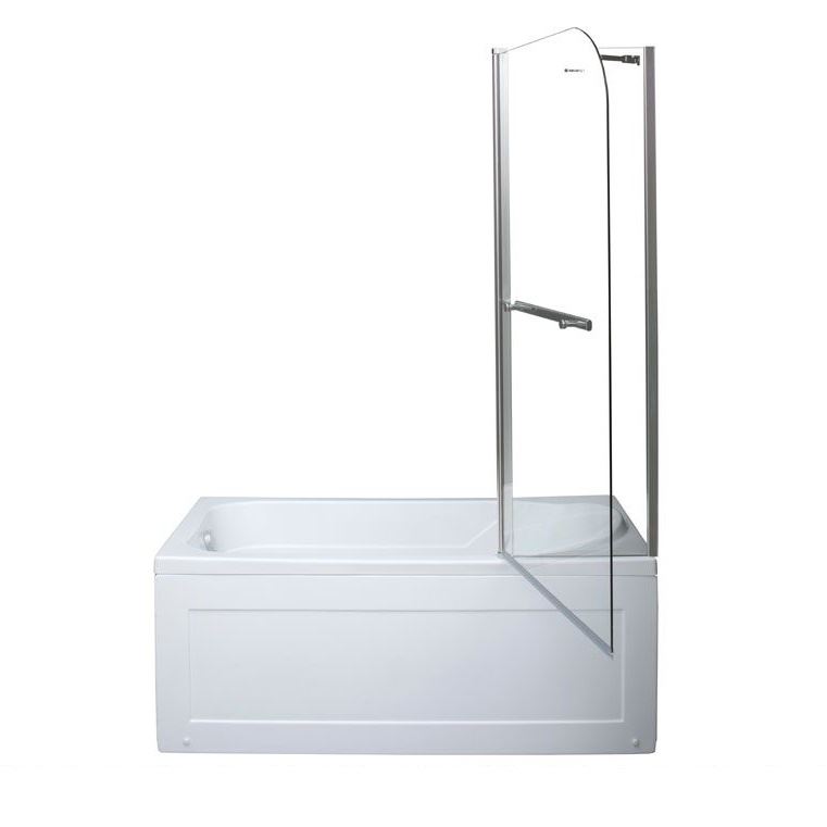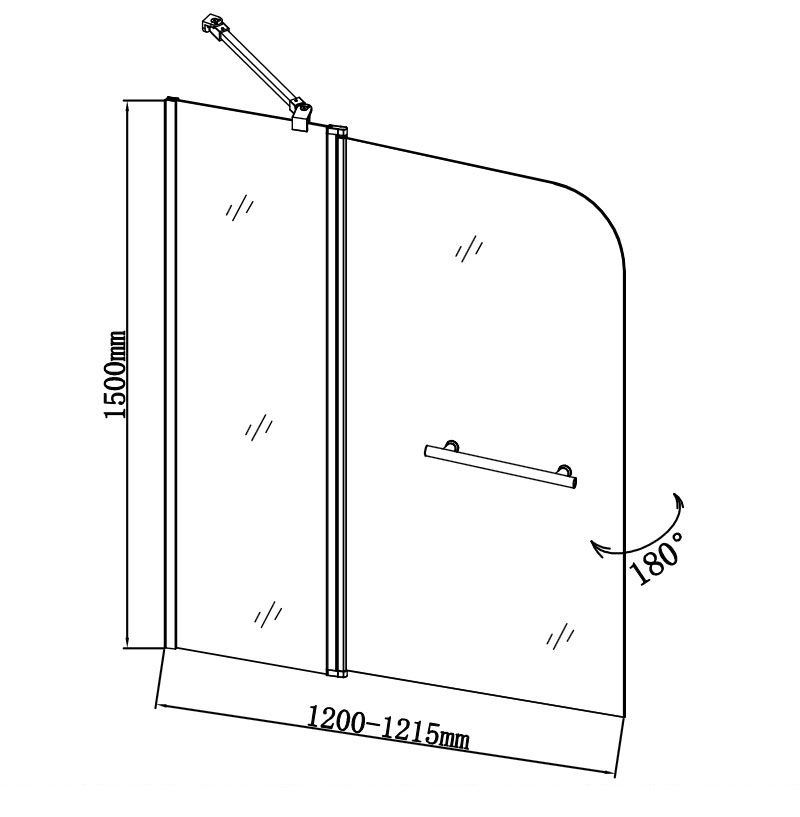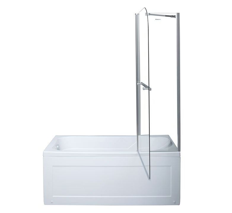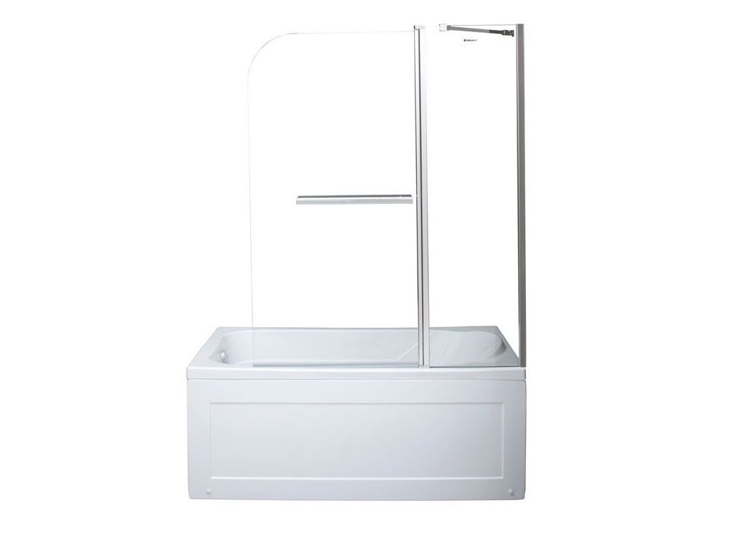 Изделие состоится из двух секций: неподвижной и подвижной. Профиль крепится к стене и также фиксируется в верхней части. Слегка закругленная дверка, которая вместе с неподвижной секцией имеет ширину 120 см, выполнена из прозрачного закаленного стекла толщиной 6 мм. Для удобства открывания на стеклянной поверхности предусмотрена ручка.