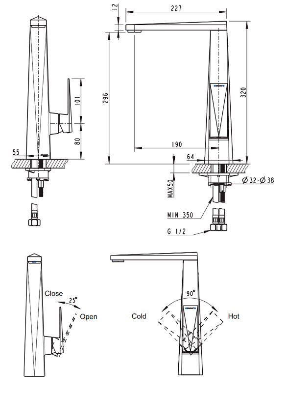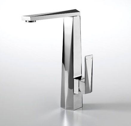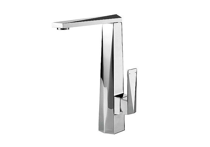 Оригинальный смеситель необычной формы выполнен из латуни с хромированным покрытием. Высокий излив снабжен поворотным механизмом вращения. Рычаг управления расположен непосредственно на корпусе смесителя, благодаря чему вся конструкция очень компактна и для монтажа требует всего лишь одно отверстие.