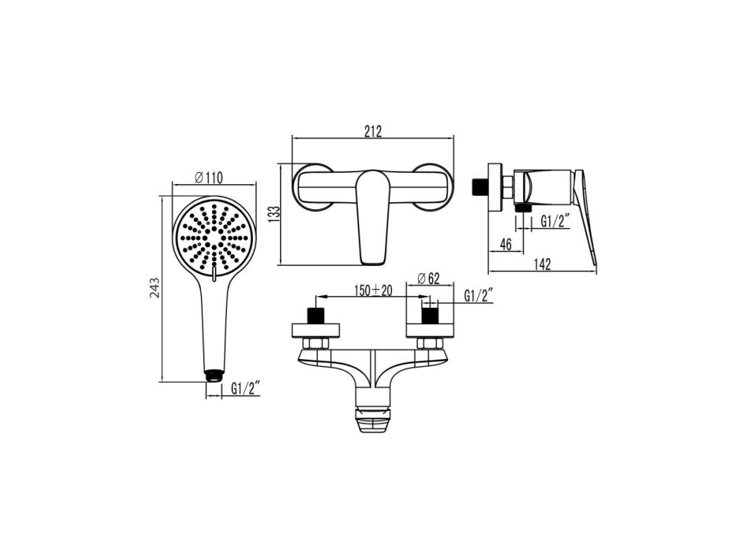 - Аксессуары в комплекте: шланг 1,5 м, настенное поворотное крепление, 3-функциональная лейка Ø110х243 мм