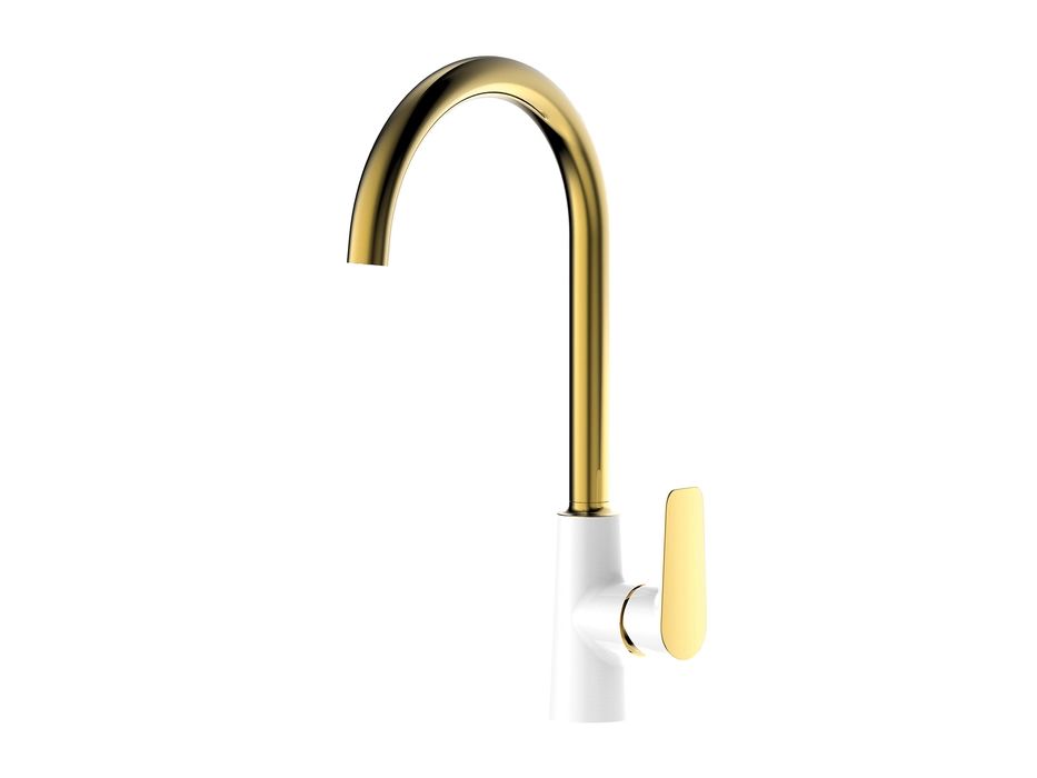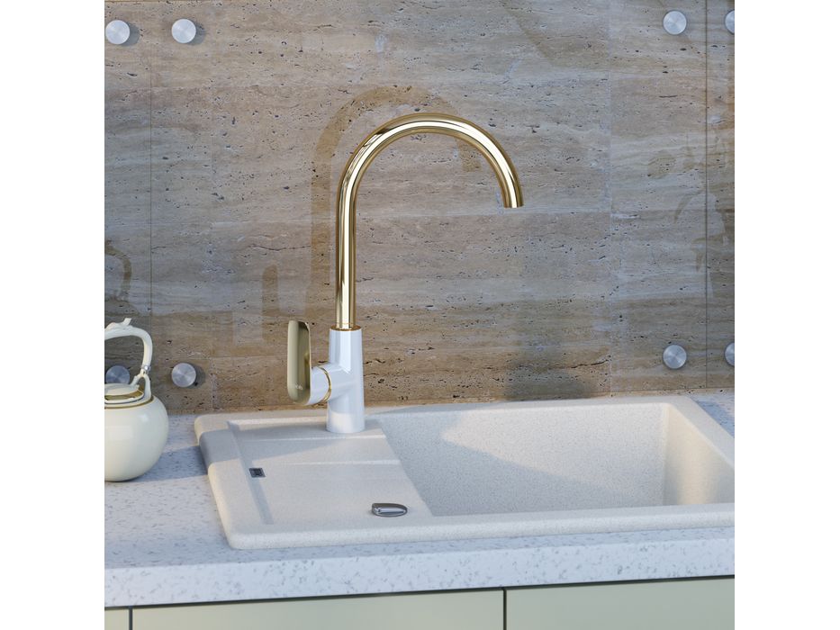 Смеситель для кухни из коллекции Cloud – скромное очарование функциональной роскоши. Элегантное сочетание белого и золотого цветов создает стильный продукт, который подойдет к интерьеру в современном и классическом стиле. Высокий излив (281 мм) поворачивается на 360 градусов, благодаря чему им удобно пользоваться на любой кухонной мойке. В комплекте гибкая подводка и крепеж.