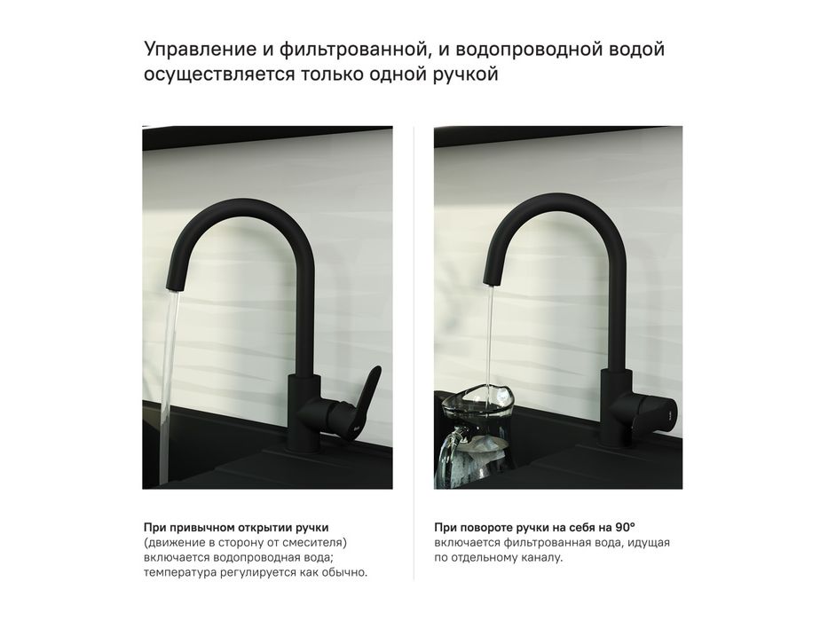Смеситель для кухни Cuba в трендовом черном цвете с каналом для фильтрованной воды представляет уникальную технологию управления фильтрованной водой, которая практически не имеет аналогов. Теперь, чтобы налить стакан чистой воды, не нужна вторая ручка, — достаточно просто повернуть основную ручку в закрытом состоянии. Встроенный отдельный канал для фильтрованной воды позволяет, при подключении к любому фильтру, наслаждаться чистой питьевой водой прямо из смесителя. Нет необходимости устанавливать отдельный смеситель и сверлить под него отверстие.
