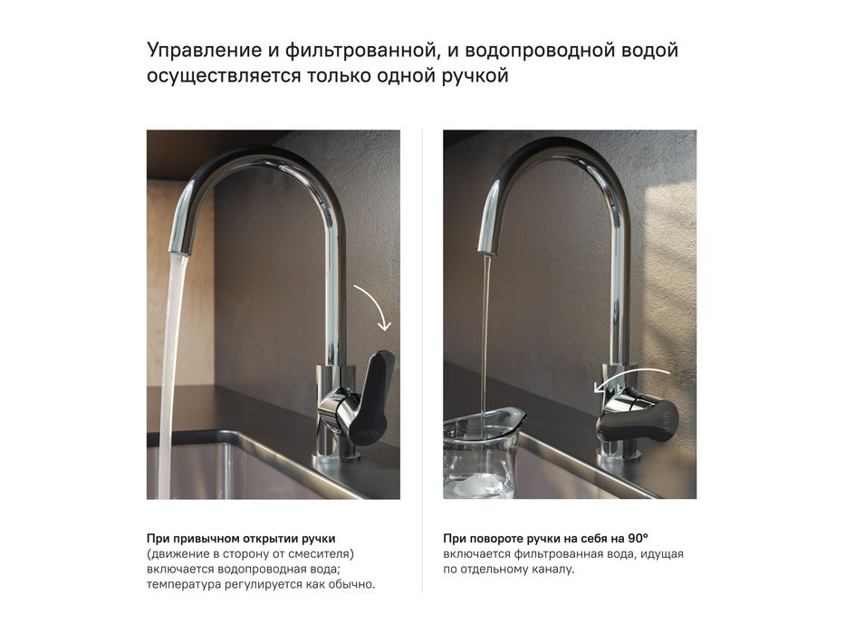 Встроенный отдельный канал для фильтрованной воды позволяет, при подключении к любому фильтру, наслаждаться чистой питьевой водой прямо из смесителя. Нет необходимости устанавливать отдельный смеситель и сверлить под него отверстие.