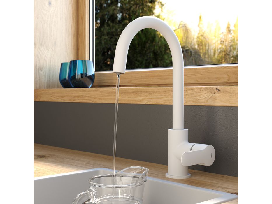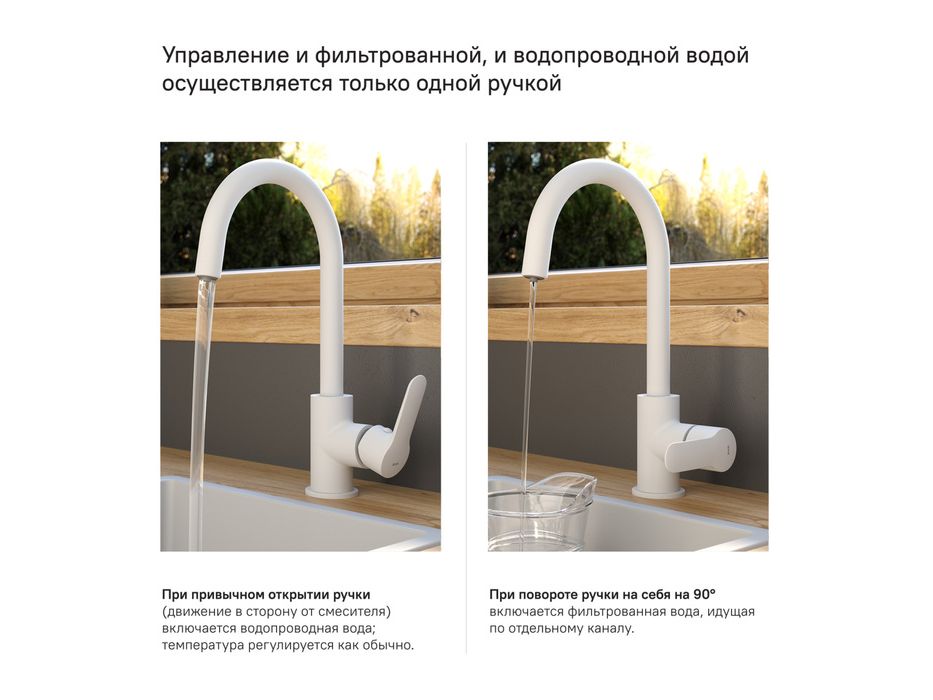 Однозахватный смеситель для кухни Cuba в актуальном матовом белом цвете имеет универсальный привлекательный дизайн и простую округлую форму излива. Смеситель оснащен отдельным каналом для фильтрованной воды и представляет уникальную технологию ее подачи, которая практически не имеет аналогов. Возможность подключения фильтра любого производителя позволит наслаждаться чистой водой прямо из смесителя простым поворотом ручки смесителя в закрытом состоянии. Отдельное отверстие в мойке под фильтр больше не потребуется.