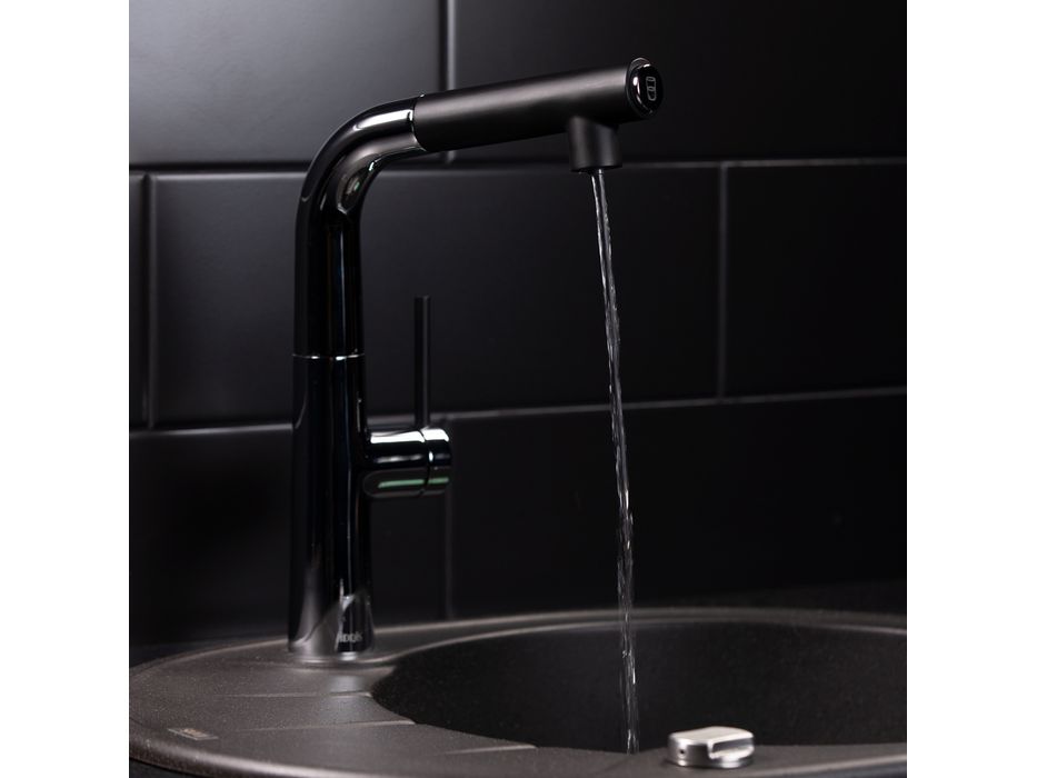 Cмеситель для кухни Pure с отдельным каналом для подачи фильтрованной воды не требует дополнительного отверстия в мойке под фильтр. К смесителю можно подключить фильтр любого производителя и наслаждаться чистой водой прямо из смесителя – она удобно включается простым нажатием кнопки на изливе. Сочетание хрома и матовых черных деталей делает смеситель стильным и оригинальным.