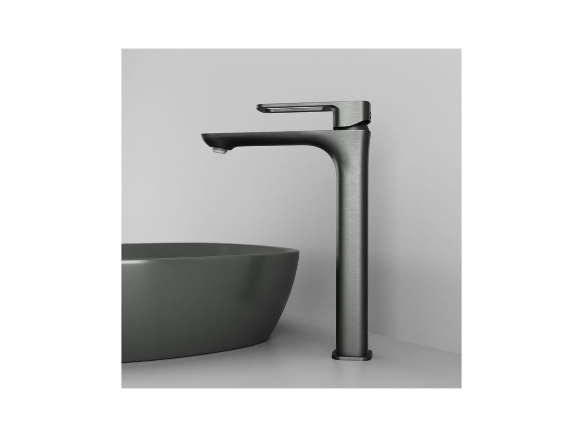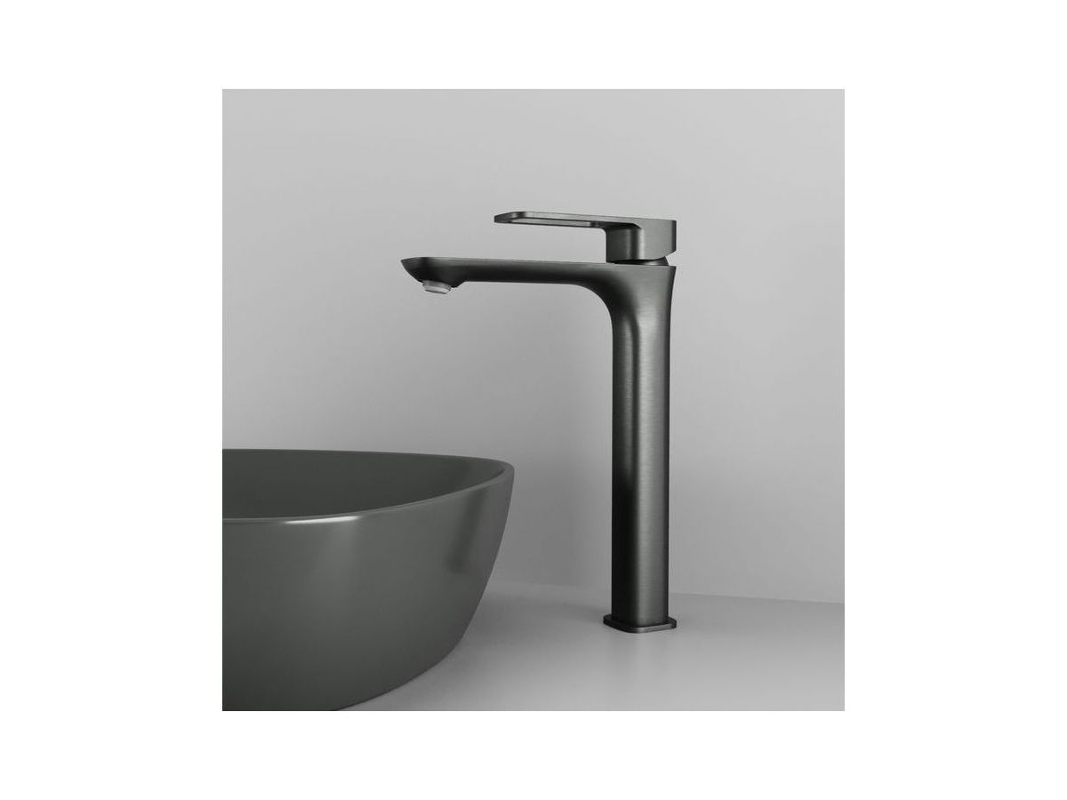 Высокий смеситель для настольного умывальника Slide в стильном графитовом цвете отлично дополнит настольный умывальник-чашу. Отверстие-петля на ручке выполняет декоративную и при этом практичную роль — ее легко захватить даже намыленной рукой и отрегулировать напор или температуру. Силиконовый аэратор эстетично скрыт в корпусе излива. В комплекте гибкая подводка и комплект крепежа.
