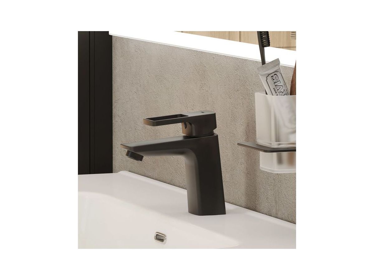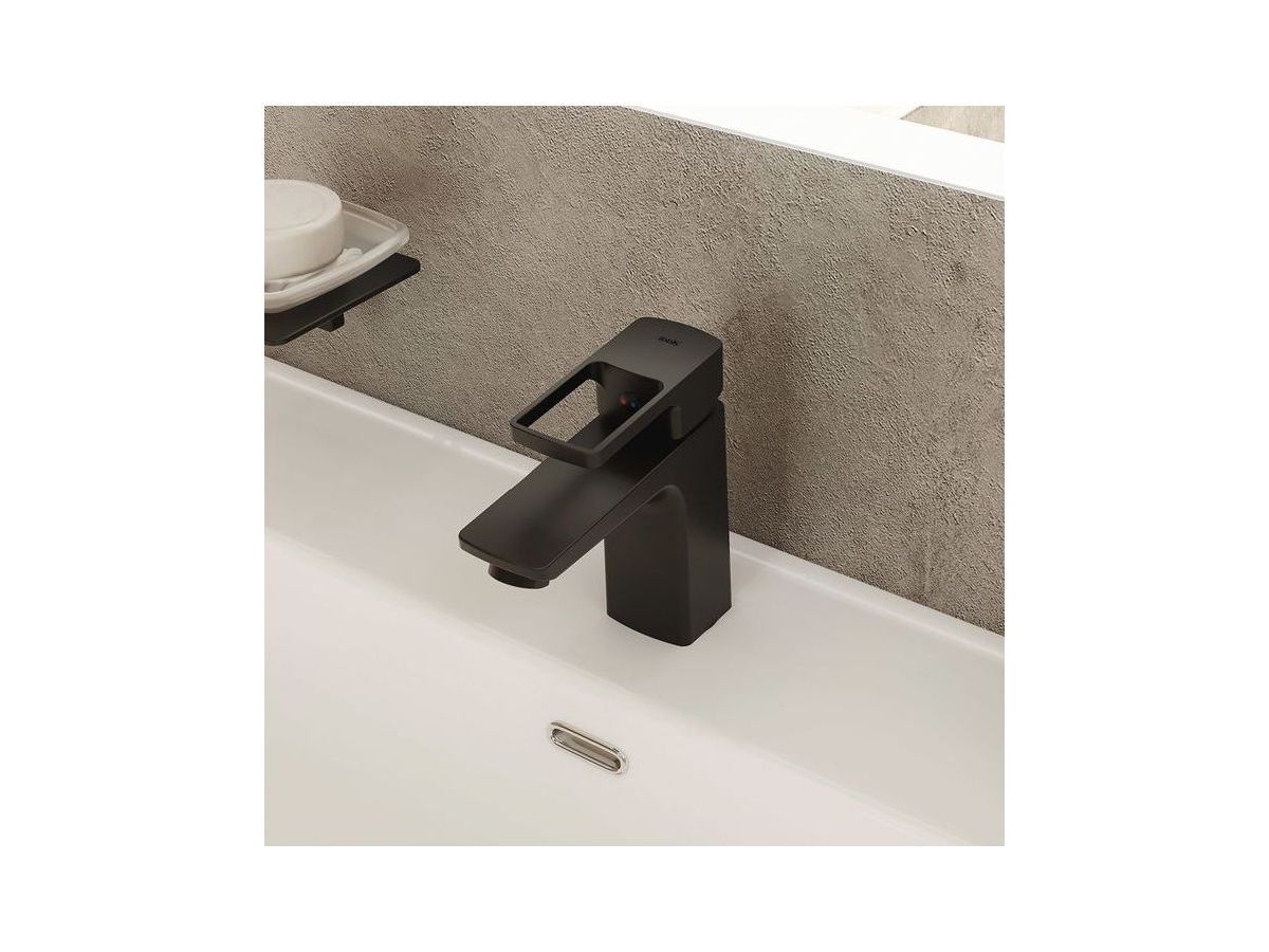 Смеситель для умывальника из коллекции Bild в актуальном черном матовом цвете отличается четкими геометрическими формами и уникальным дизайном ручки-петли с тонкой изящной рамкой — ее толщина составляет всего 2 мм. Благодаря улучшенной эргономике ручка смесителя удобно ложится в руку, делая управление невероятно комфортным.