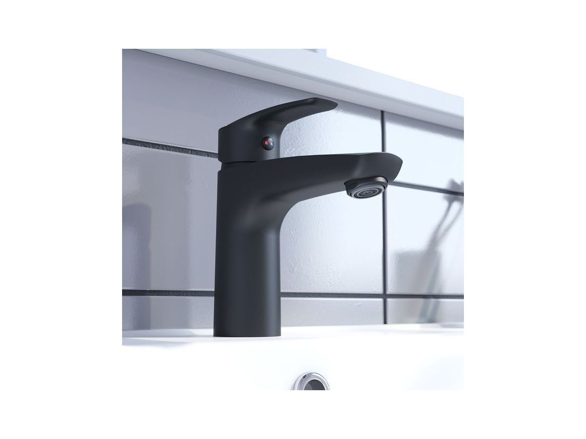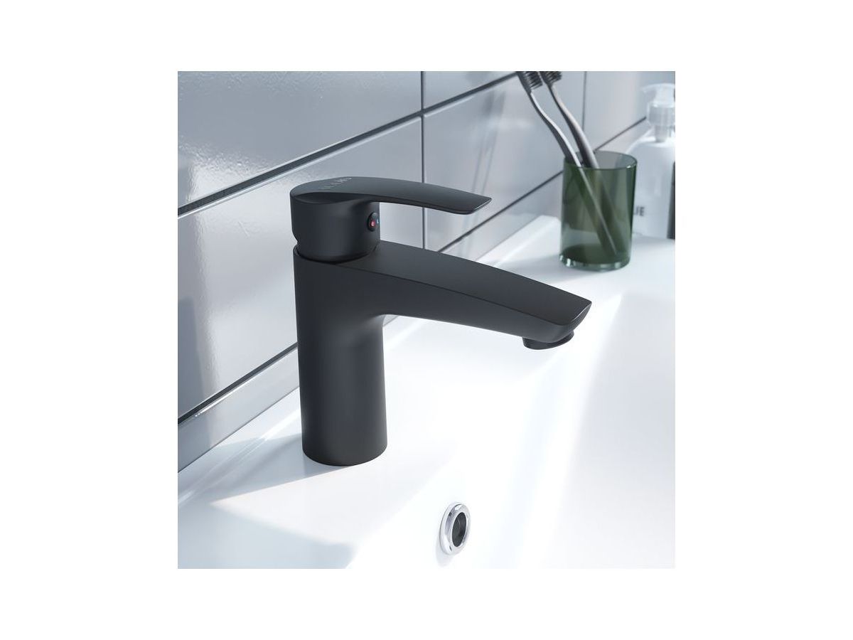 Смеситель для умывальника Ray имеет универсальный дизайн и благодаря стильному матовому черному цвету станет ярким акцентом современного интерьера ванной. Аэратор в смесителе расположен под наклоном, направляя струю в удобную точку, что делает комфортным и мытье рук, и наполнение больших емкостей.