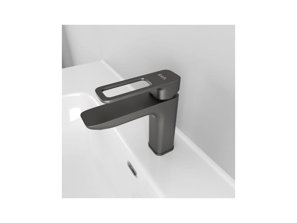 Смеситель для умывальника Slide в стильном оттеСмеситель для умывальника Slide в стильном оттенке графит. Отверстие-петля на ручке выполняет декоративную и при этом практичную роль — ее легко захватить даже намыленной рукой и отрегулировать напор или температуру. Поворотный аэратор позволяет менять наклон потока воды, что делает комфортным и мытье рук, и наполнение больших емкостей.