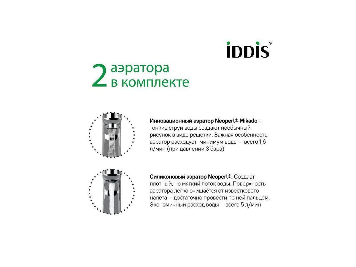 — Силиконовый аэратор Neoperl®. Создает плотный, но мягкий поток воды. Поверхность аэратора легко очищается от известкового налета — достаточно провести по ней пальцем. Экономичный расход воды — всего 5 л/мин.