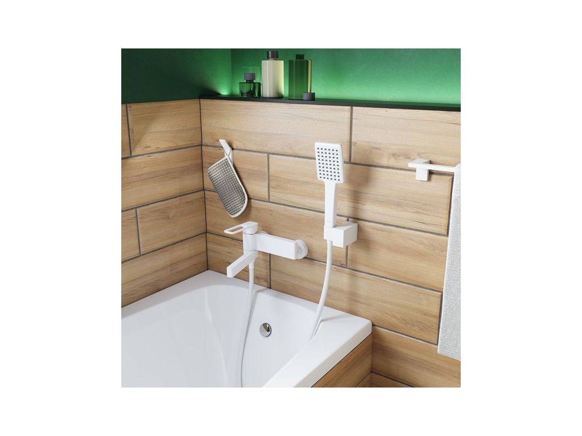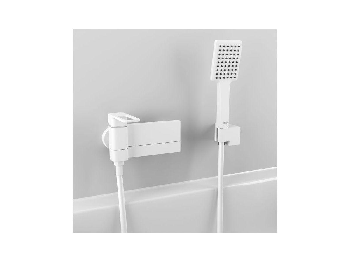 Смеситель для ванны Slide в актуальном матовом белом цвете со складным изливом — стильное функциональное решение без лишних деталей, подойдет и для ванны, и для душевой кабины. Отверстие-петля на ручке выполняет декоративную и при этом практичную роль — ее легко захватить даже намыленной рукой и отрегулировать напор или температуру. В комплекте душевые аксессуары в тон смесителю — прямоугольная лейка, гладкий шланг из ПВХ с защитой от перекручивания и держатель для лейки.
