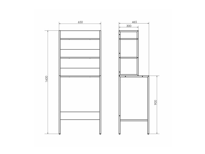Напольный стеллаж изготовлен из стального профиля, покрытого черной матовой эмалью, полки из ЛДСП цвета бетон светлый. Стеллаж для установки над стиральной машиной.