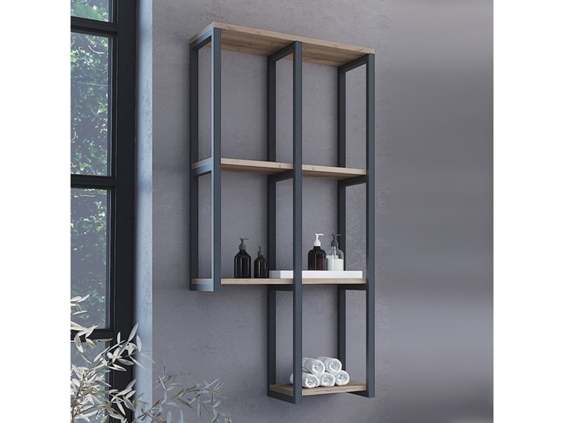 Стеллаж подвесной «Порто-50» изготовлен из стального профиля, покрытого черной эмалью, полки из ЛДСП цвета дуб дымчатый.