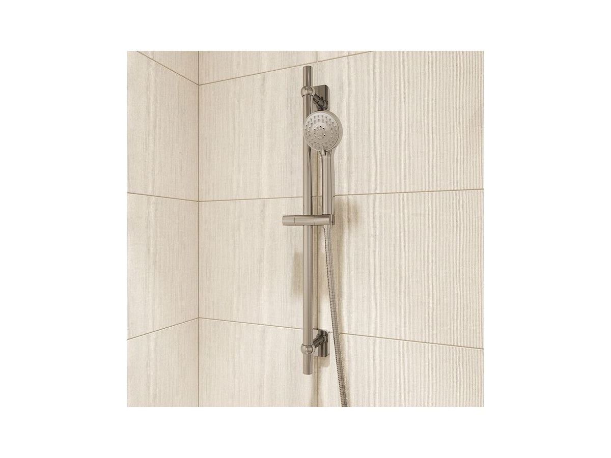 Стойка для душа, хром, нержавеющая сталь с никель-хромовым покрытием, высота 700 мм, диаметр 22 мм. Оба крепления свободные. Держатель лейки из ABS-пластика, поворотное крепление, регулировка наклона лейки. Крепеж в комплекте.