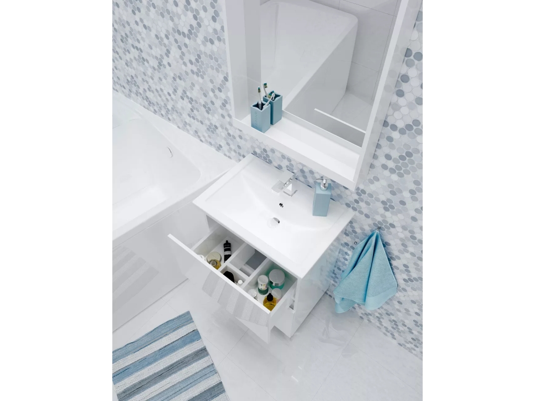 Стильная и лаконичная тумба для ванной комнаты, в дизайне которой нет ничего лишнего - только минимализм и акцент на безоговорочную функциональность. Отсутствие ручек и строгие геометрические формы делают ее актуальной для интерьеров в абсолютно любой современной или эклектичной стилистике. Благодаря качественной фурнитуре ежедневное использование тумбы отличается максимальным удобством. Практичное разделение ящиков на небольшие отсеки позволяет с комфортом организовать хранение косметики и других вещей. Глянцевая белая поверхность гармонично дополнит пространства в любой цветовой гамме.