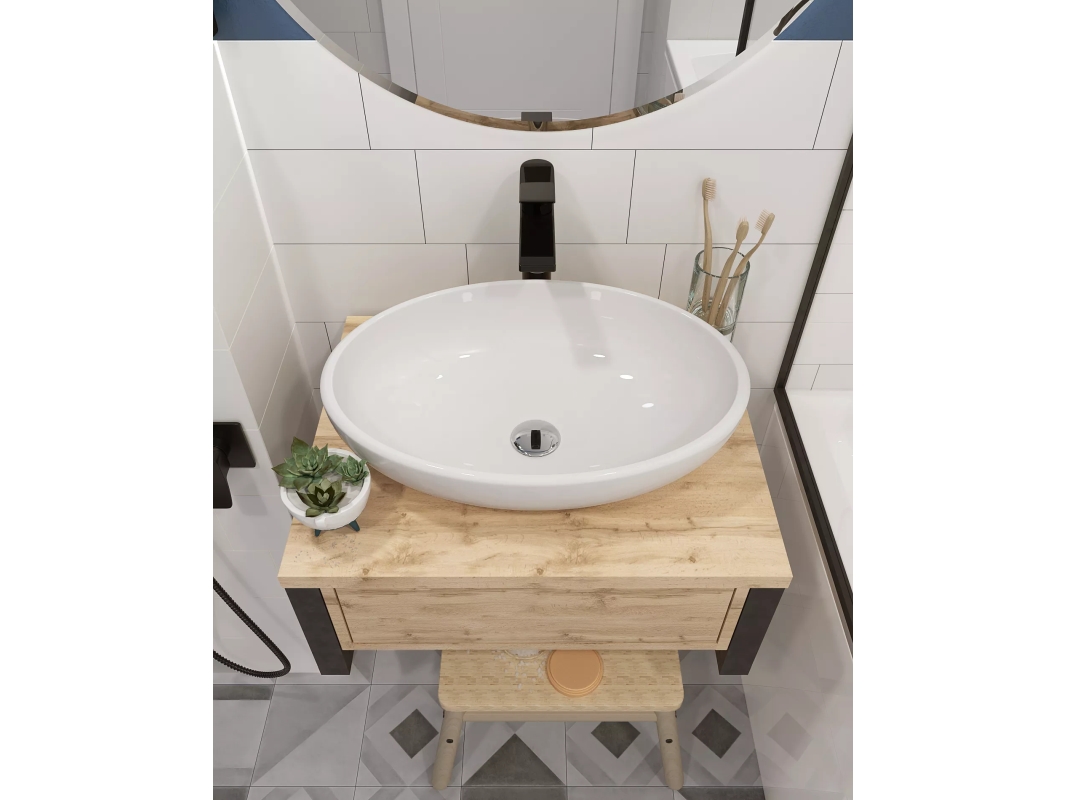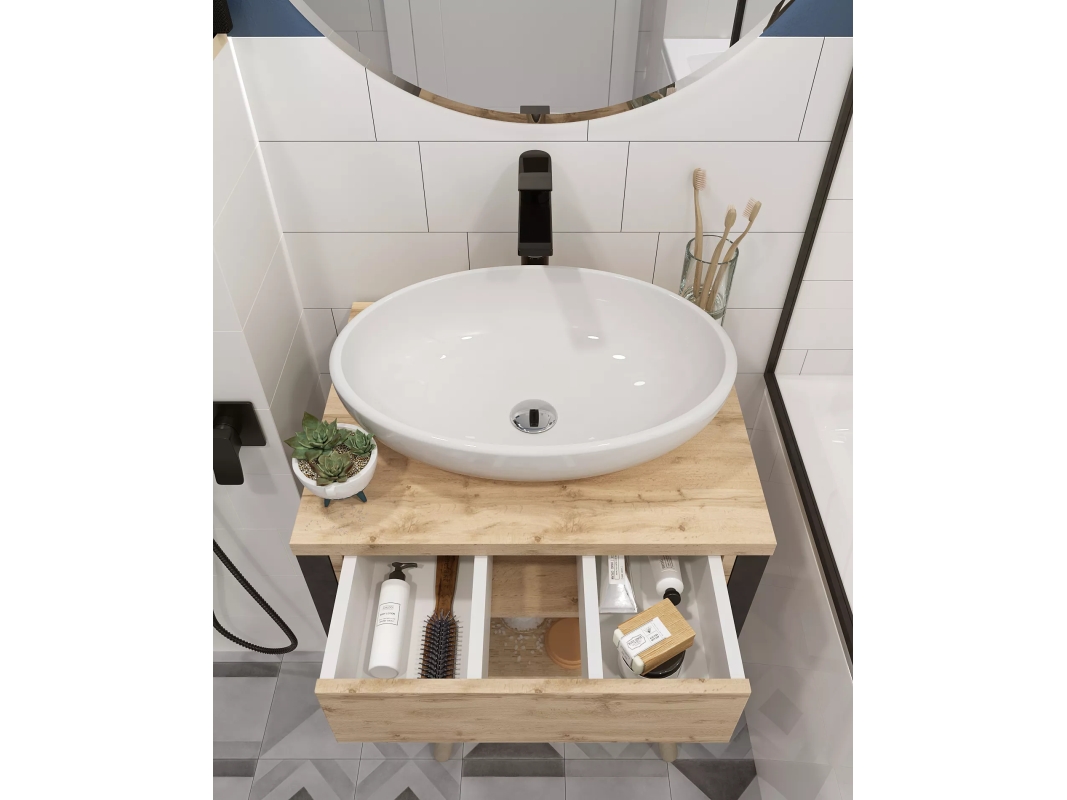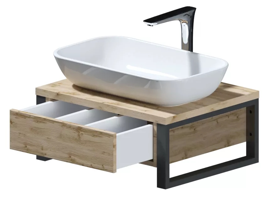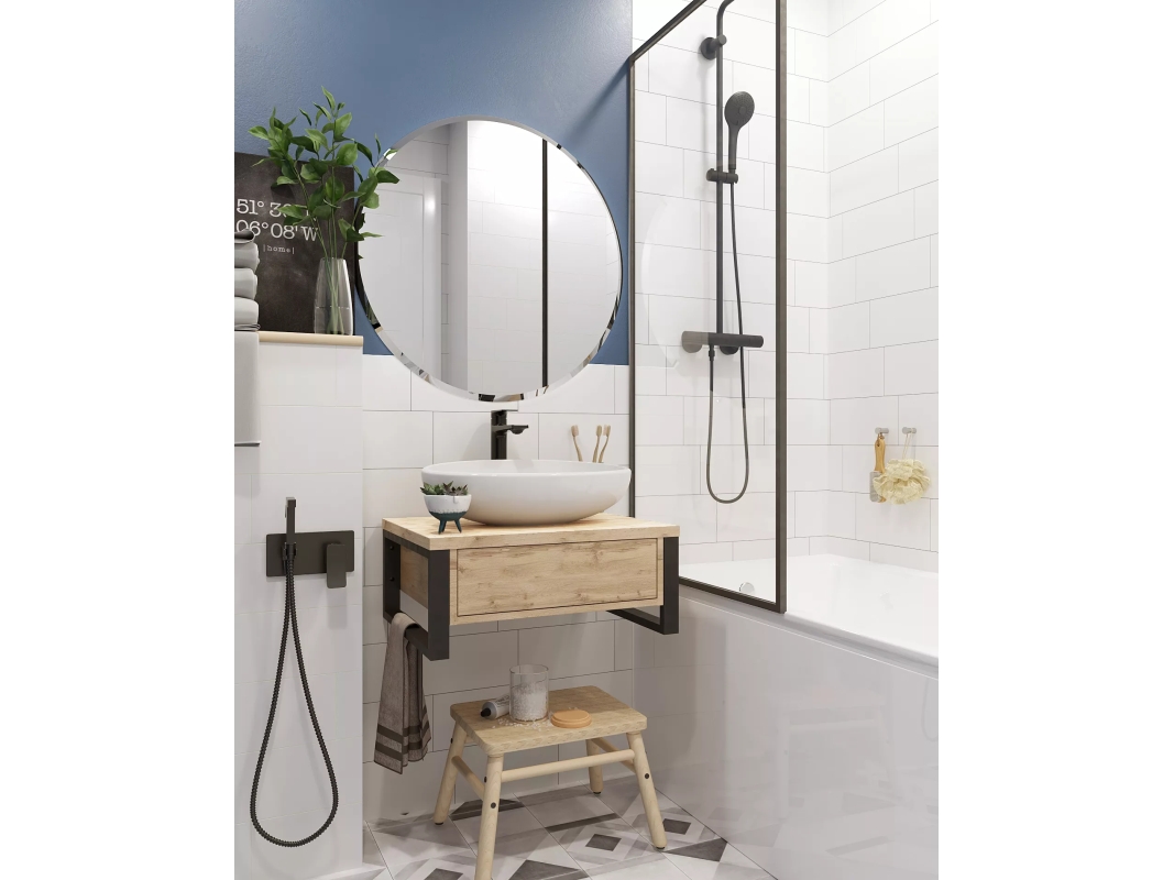 Тумба в стиле лофт, покупка которой решает сразу несколько важных вопросов в функциональном оформлении ванной комнаты. Ее дизайн построен на гармоничном сочетании дерева и металла: корпус с естественной фактурой дерева дополнен металлическими кронштейнами, которые также могут использоваться в качестве рейлов для размещения полотенец и халатов. Выдвижной ящик без ручки, открывающийся одним простым нажатием, разделен на несколько отсеков для удобства организации процесса хранения. Также тумба предполагает свободное пространство для размещения косметики и предметов декора.