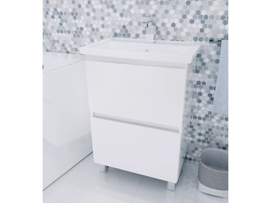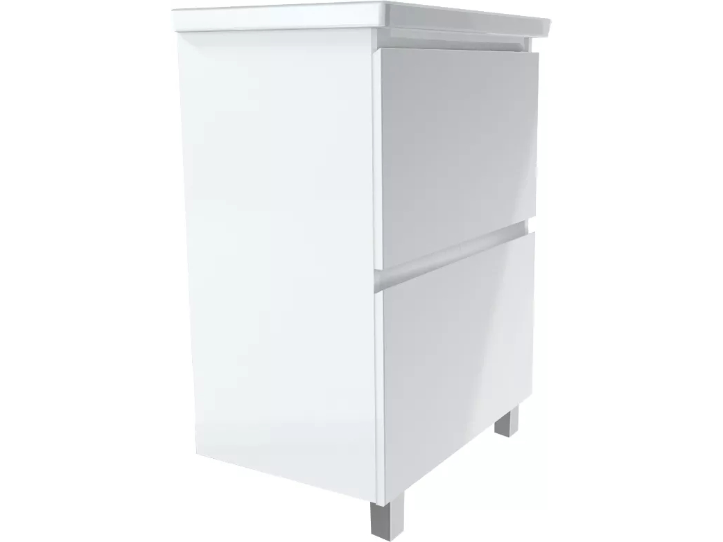 Стильная и лаконичная тумба для ванной комнаты, в дизайне которой нет ничего лишнего - только минимализм и акцент на безоговорочную функциональность. Отсутствие ручек и строгие геометрические формы делают ее актуальной для интерьеров в абсолютно любой современной или эклектичной стилистике. Благодаря качественной фурнитуре ежедневное использование тумбы отличается максимальным удобством. Практичное разделение ящиков на небольшие отсеки позволяет с комфортом организовать хранение косметики и других вещей. Глянцевая белая поверхность гармонично дополнит пространства в любой цветовой гамме.