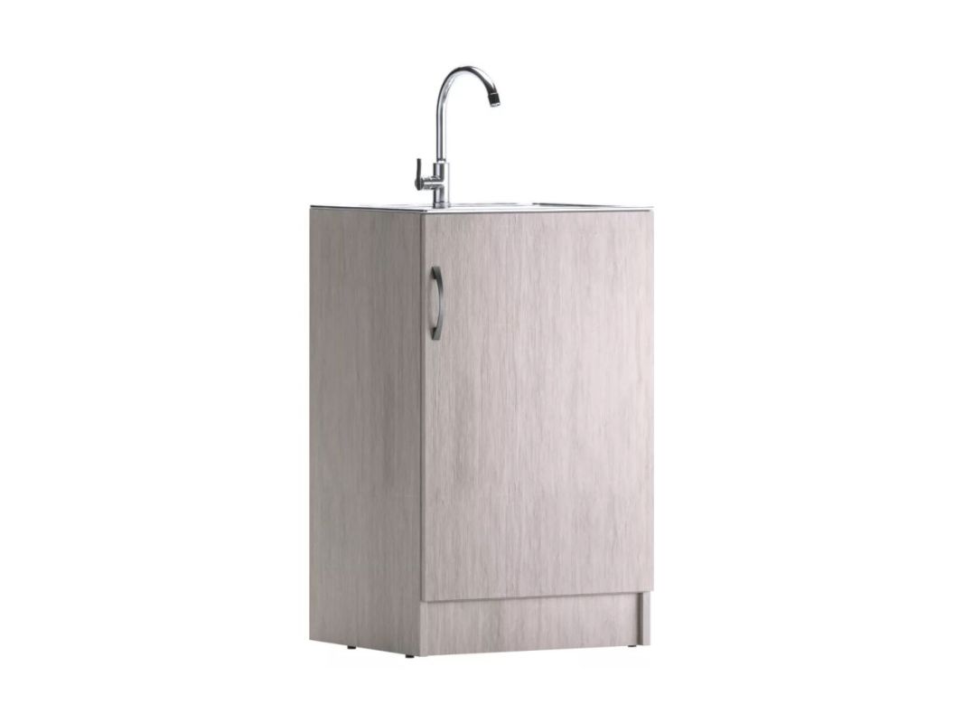 Тумба под нержавеющую мойку 45 см в ширину имеет одну дверцу. Тумбы 50 см, 60 см, 80 см и 100 см шириной, имеют две распашных дверцы. Корпус и фасад выполнены из ЛДСП.