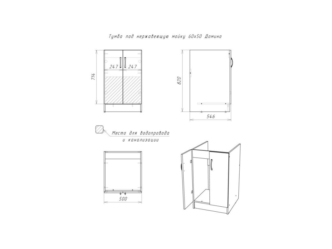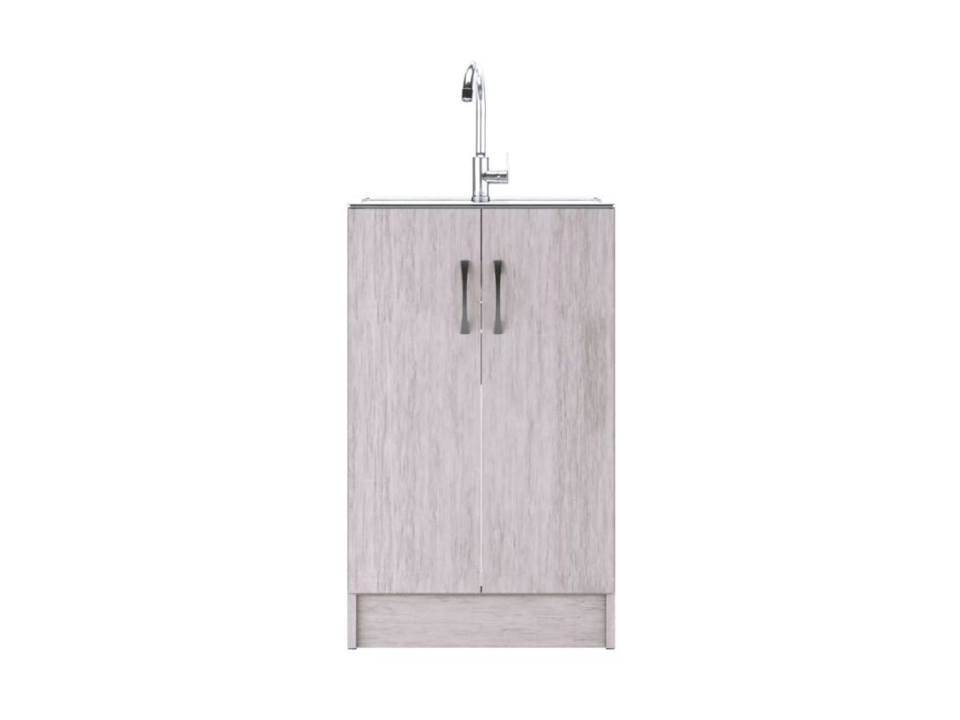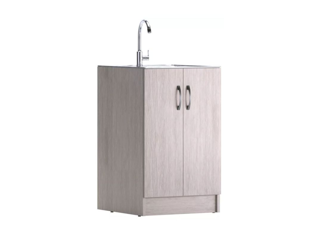 Тумба под нержавеющую мойку 45 см в ширину имеет одну дверцу. Тумбы 50 см, 60 см, 80 см и 100 см шириной, имеют две распашных дверцы. Корпус и фасад выполнены из ЛДСП.