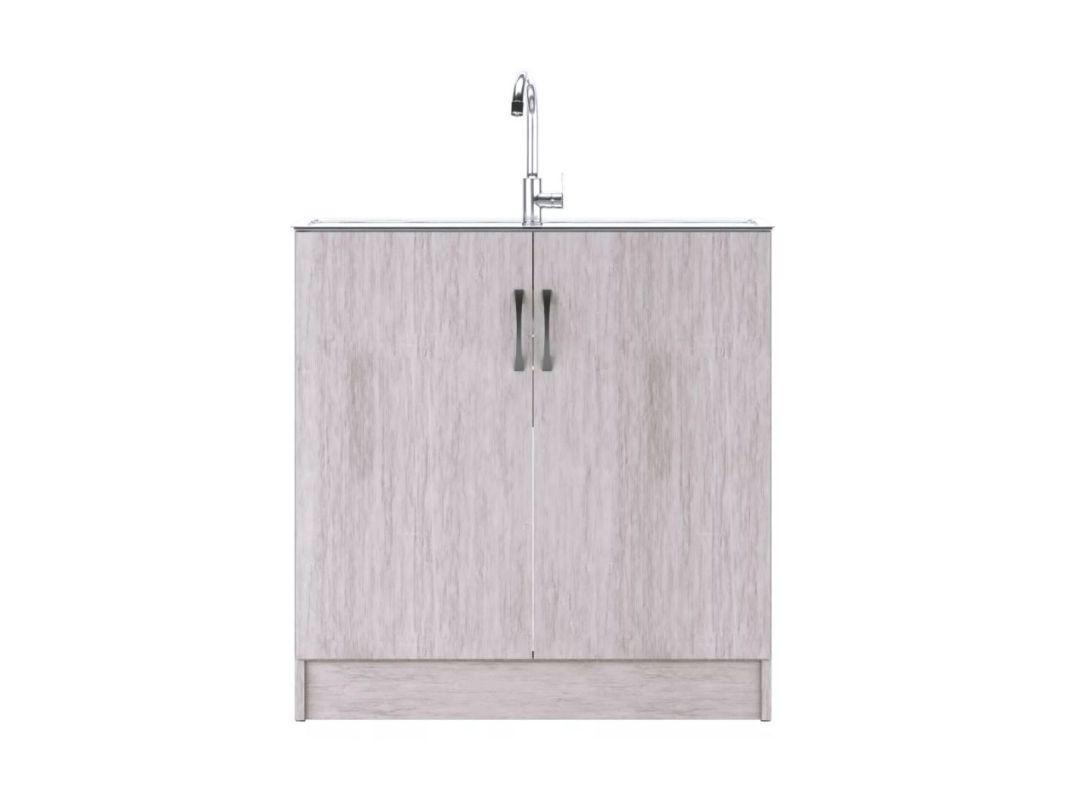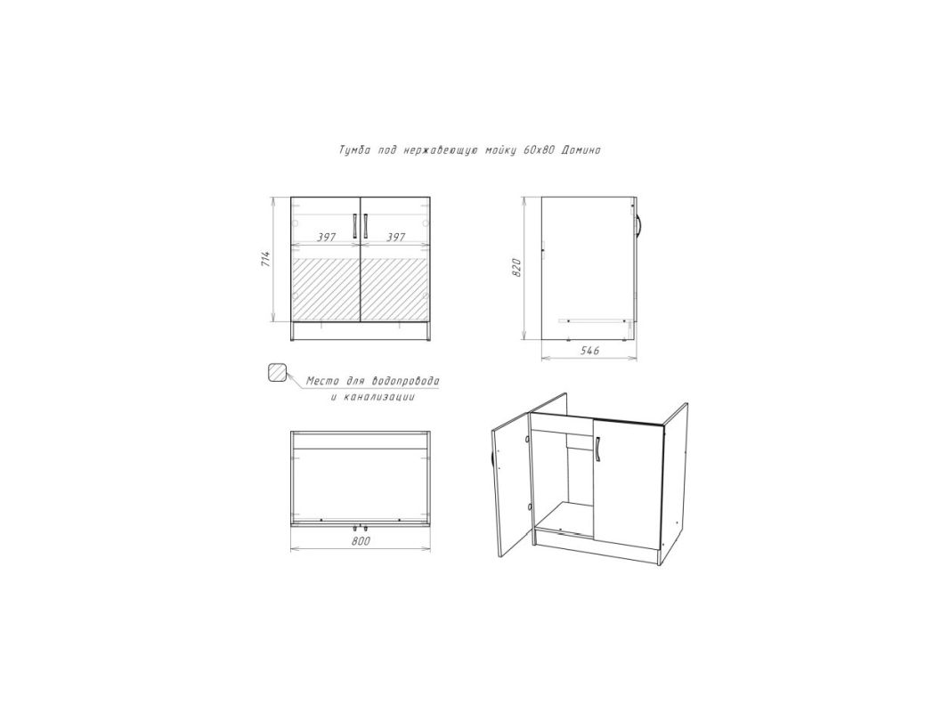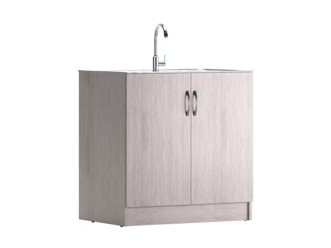 Тумба под нержавеющую мойку 45 см в ширину имеет одну дверцу. Тумбы 50 см, 60 см, 80 см и 100 см шириной, имеют две распашных дверцы. Корпус и фасад выполнены из ЛДСП.