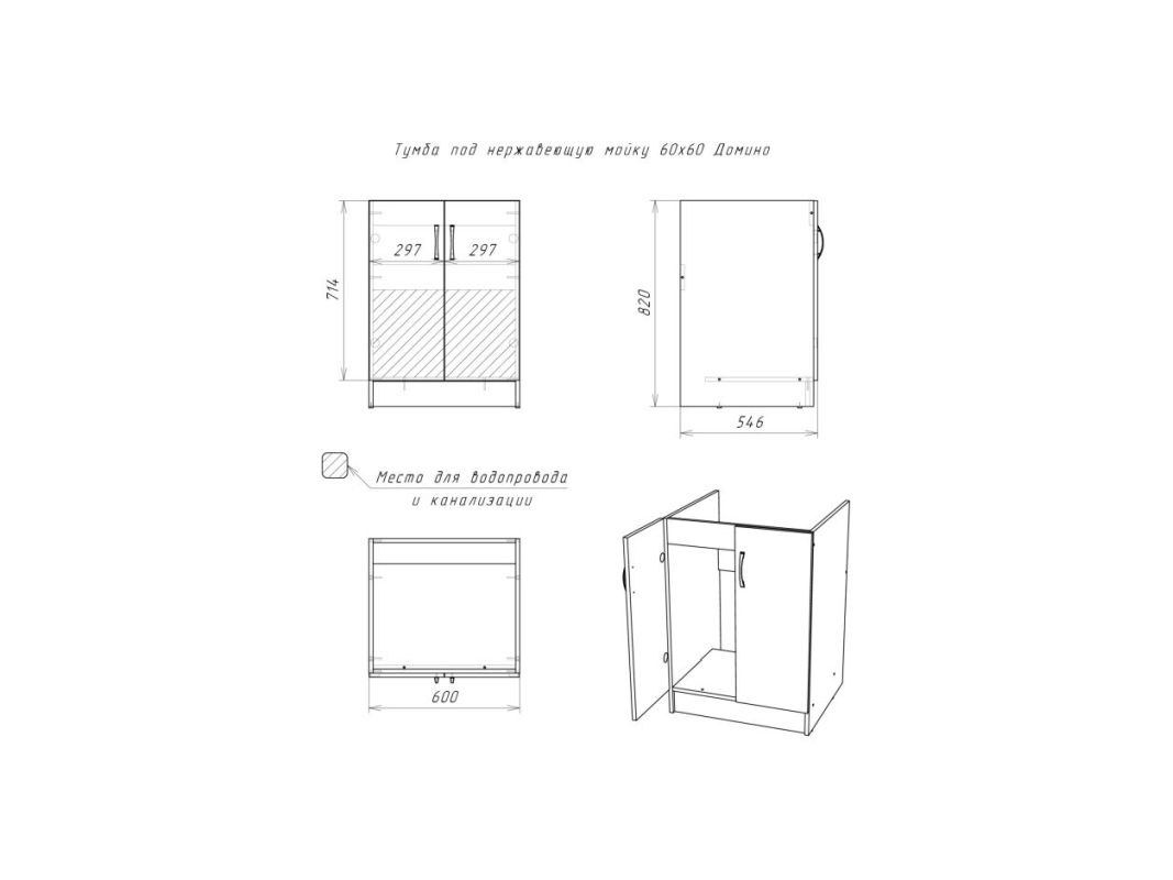 Тумба под нержавеющую мойку 45 см в ширину имеет одну дверцу. Тумбы 50 см, 60 см, 80 см и 100 см шириной, имеют две распашных дверцы. Корпус и фасад выполнены из ЛДСП.