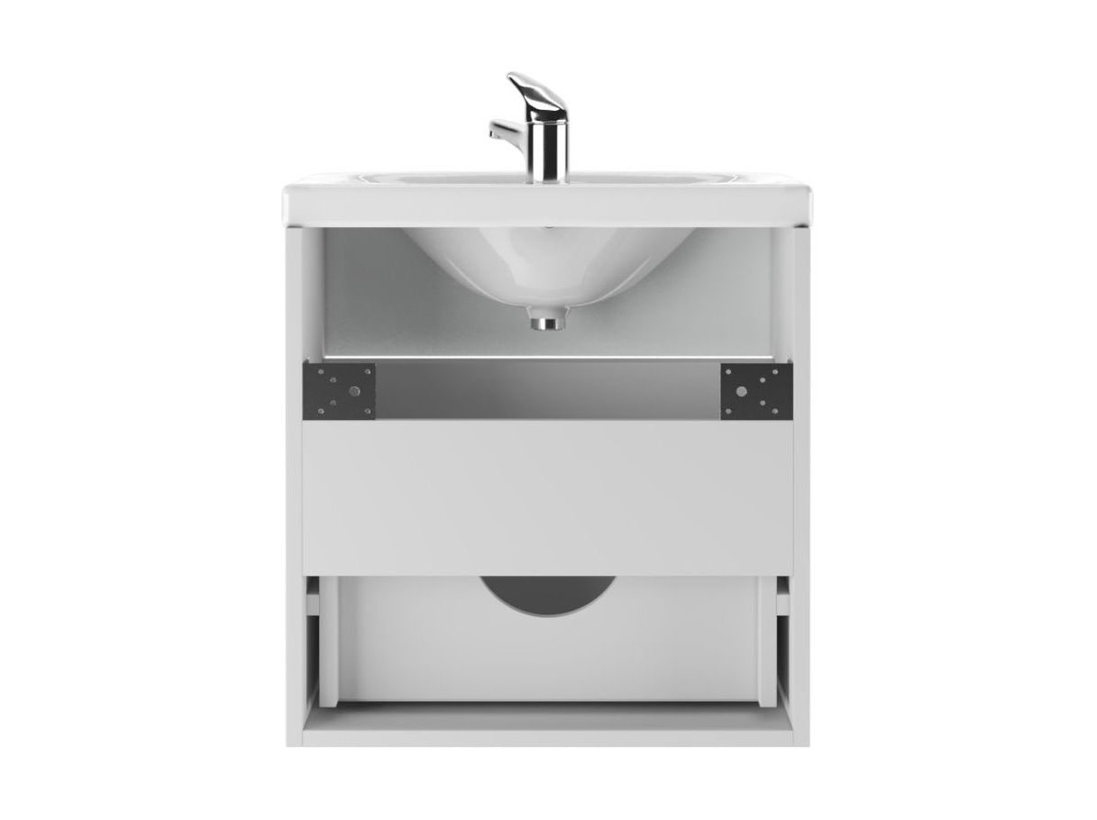 Корпус всей серии изготовлен из ЛДСП, а фасад из ЛМДФ, покрыт пленкой ПВХ. У напольной мебели возможна регулировка ножек до 30 мм, а для удобства в использовании на дверях установлены петли с доводчиком.