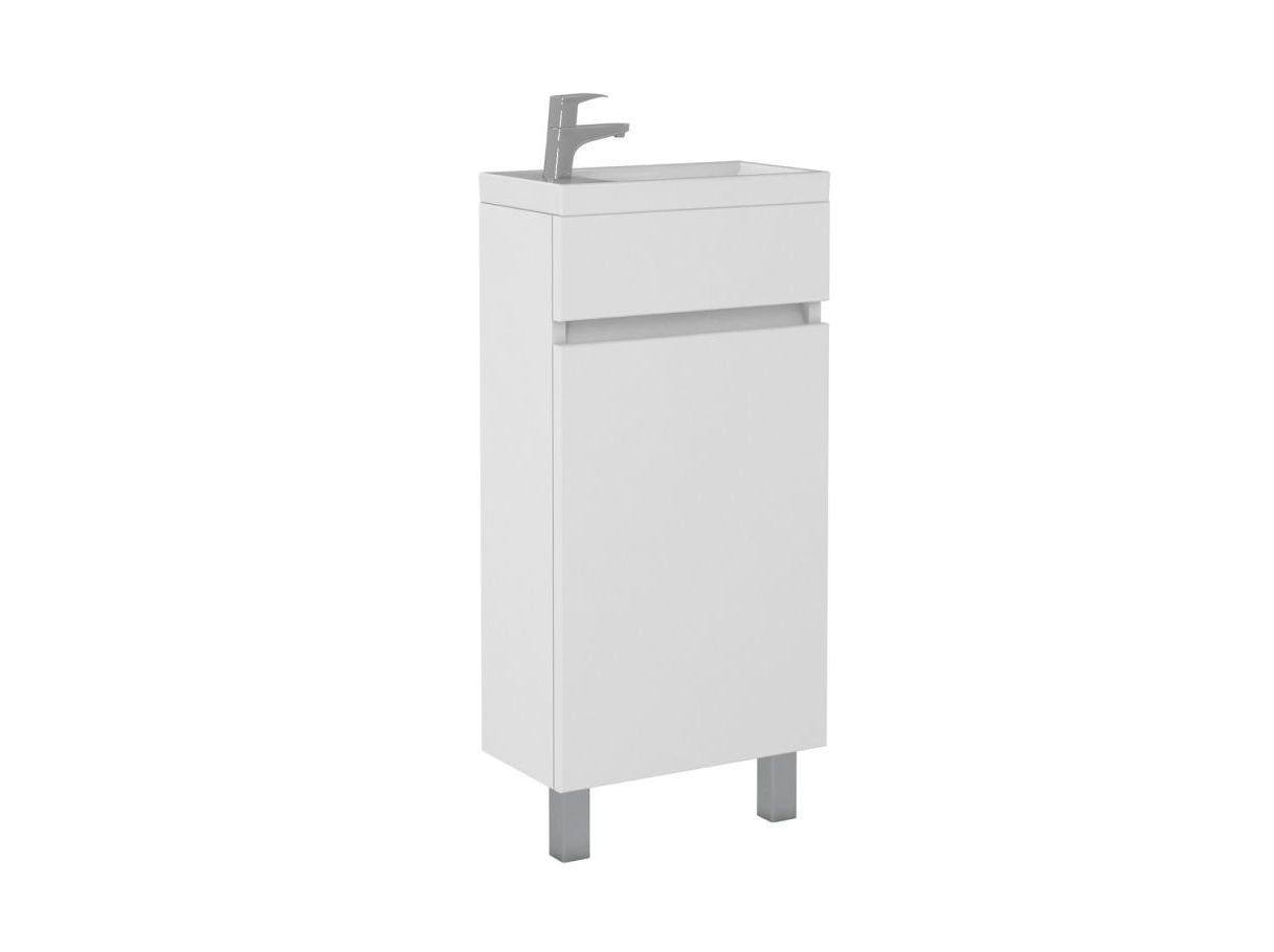 Тумбы под умывальник предусматривают удобную систему хранения, шириной также от 40 см до 80 см. Недавно серия пополнилась функциональным пеналом, шириной 60 см шириной. Корпус изготовлен из ЛДСП, фасад из ЛМДФ, обклеен пленкой ПВХ, что обеспечивает долговременную эксплуатацию. На петлях дверей установлены доводчики. У напольной мебели возможна регулировка ножек до 30 мм. Вся серия поставляется в собранном виде.