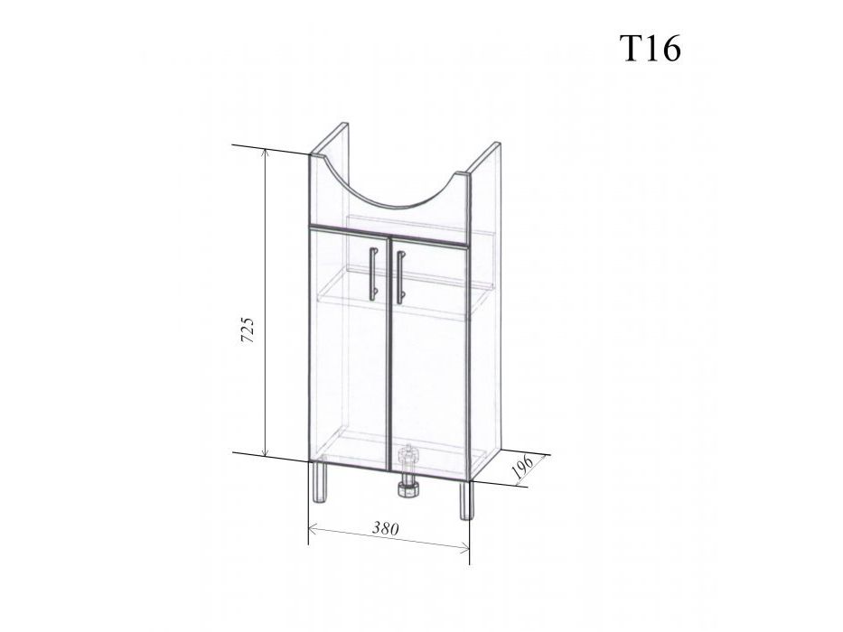 За распашными дверцами две вместительные полочки, которые предназначены для хранения необходимых в ванной комнате вещей, задняя царга-ограничитель не дает вещам упасть.