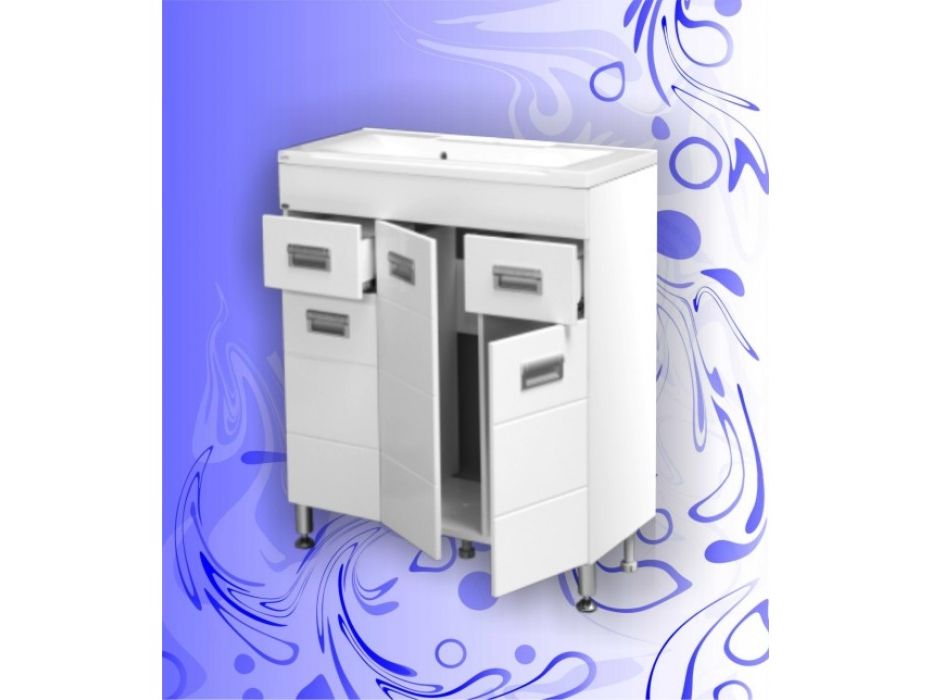 Комфорт модели создают выдвижные ящики, где можно хранить разную полезную мелочь, и вместительные отделения, за распашными дверками которых поместятся банные полотенца, халаты, белье, тапочки и другие предметы обихода ванной комнаты.
