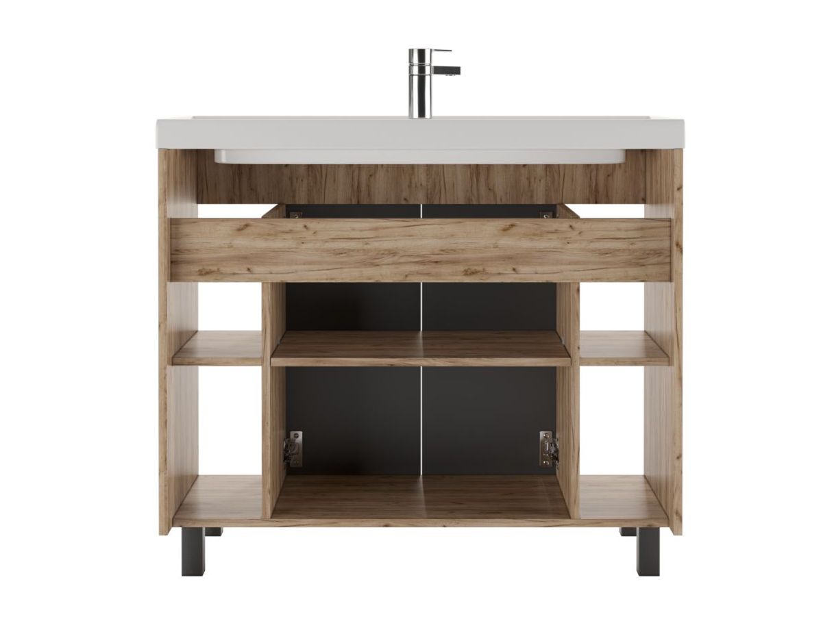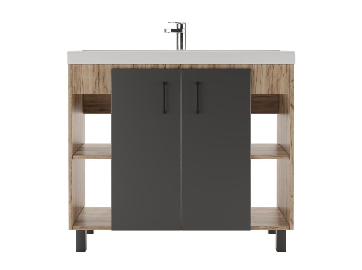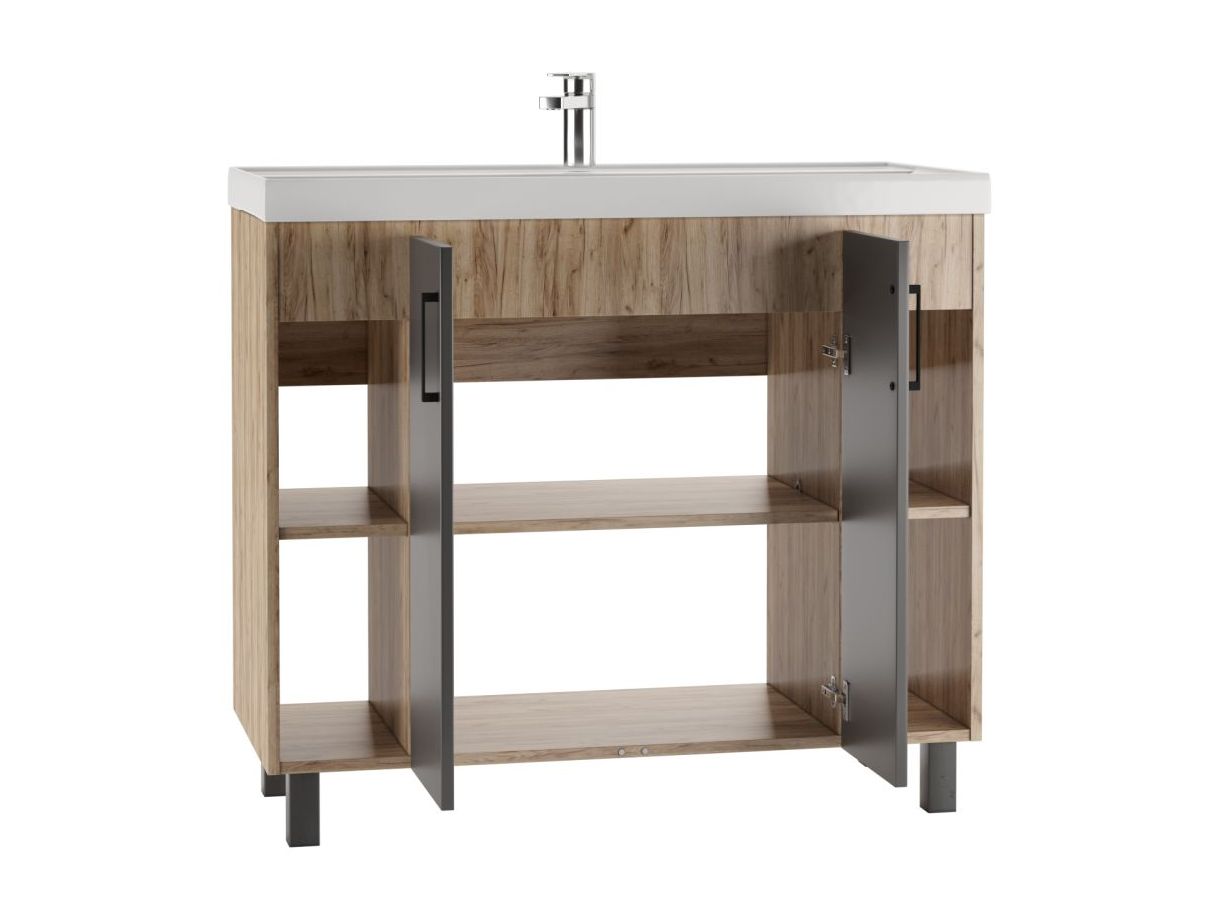 Тумбы под умывальник «ФОСТЕР», в зависимости от размера представлены с одной/двумя дверцами и полками с правой стороны.
