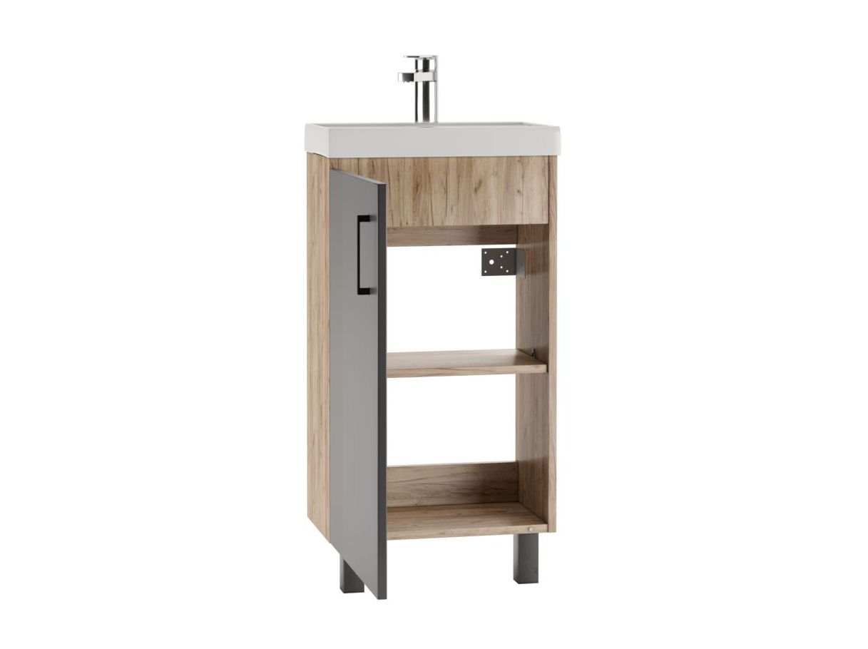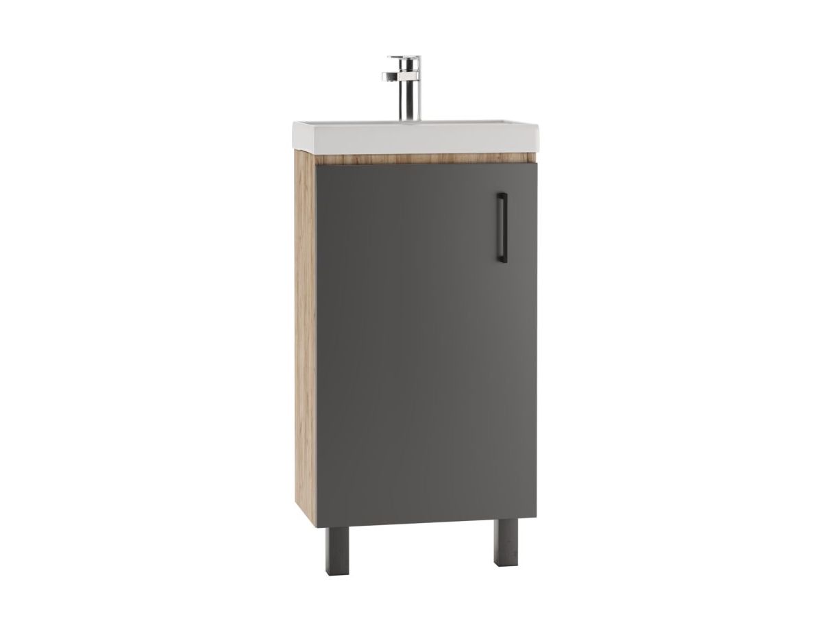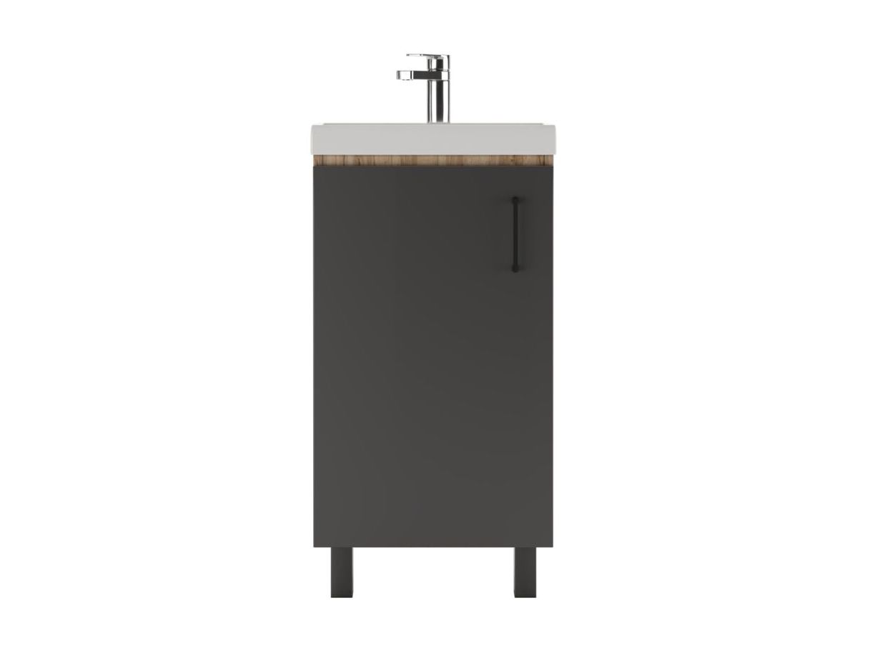 Корпус серии представлен в цвете «Дуб вотан» и выполнен из ЛДСП. Фасад из ЛДСП, покрыт пленкой ПВХ, цвета графит. Фурнитура черного цвета. Размерный ряд от 45 см до 100 см в ширину.