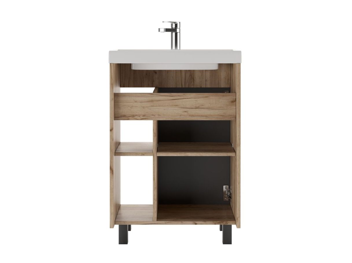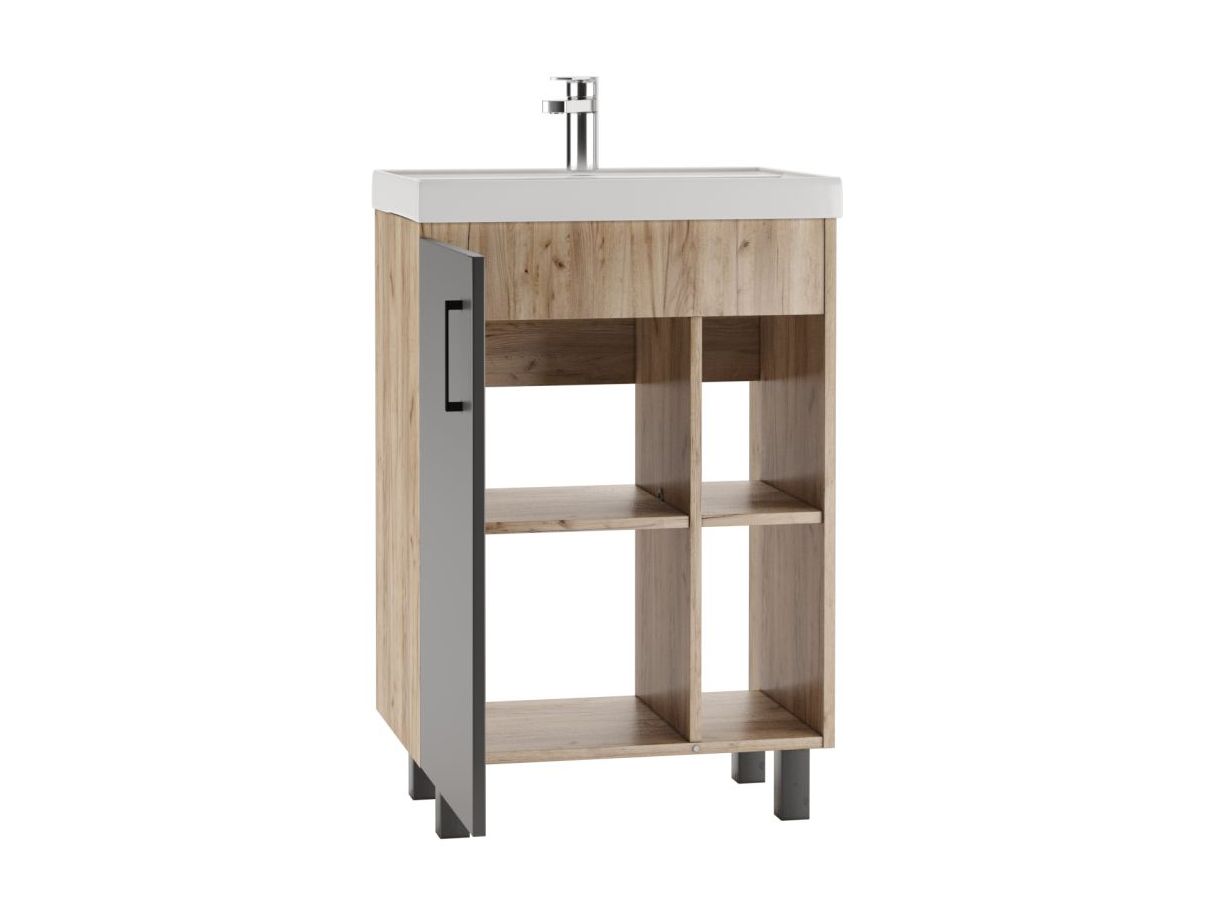 Тумбы под умывальник «ФОСТЕР», в зависимости от размера представлены с одной/двумя дверцами и полками с правой стороны.