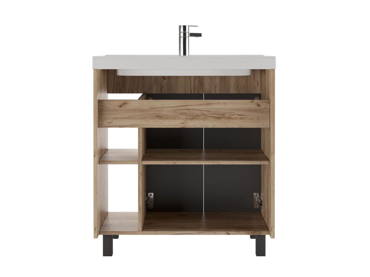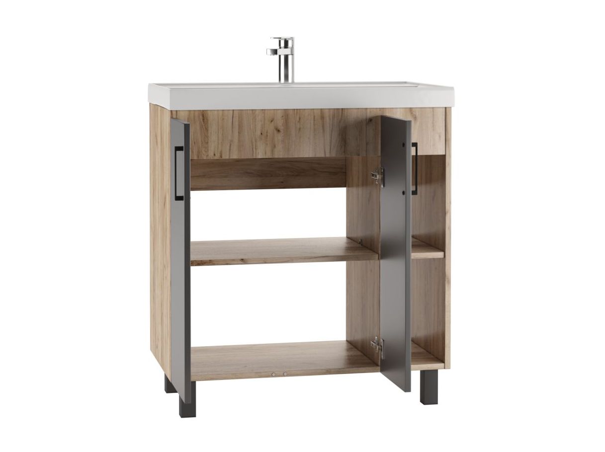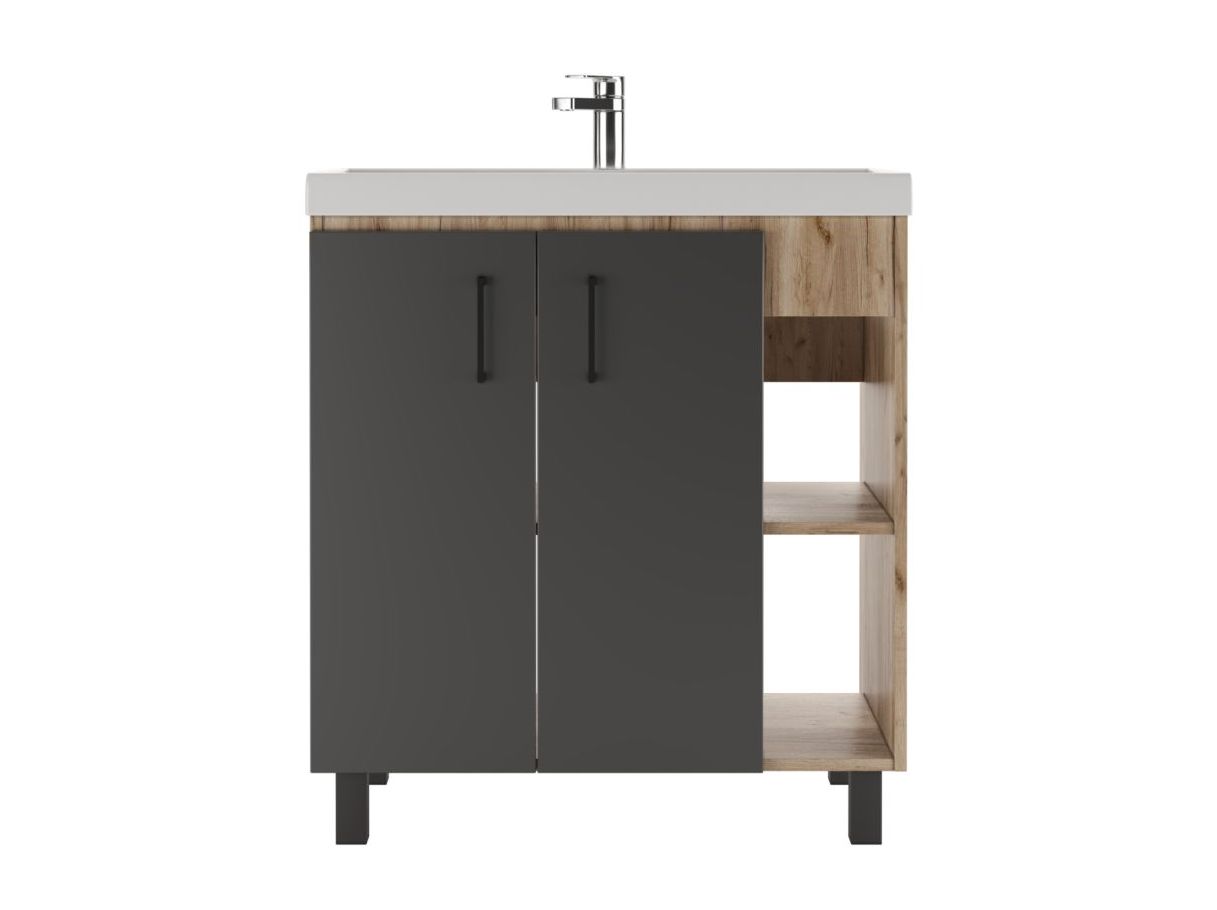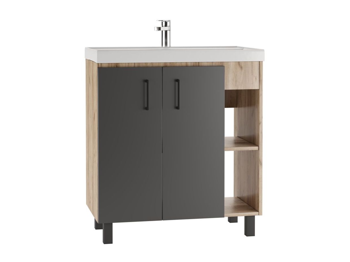 Тумбы под умывальник «ФОСТЕР», в зависимости от размера представлены с одной/двумя дверцами и полками с правой стороны.