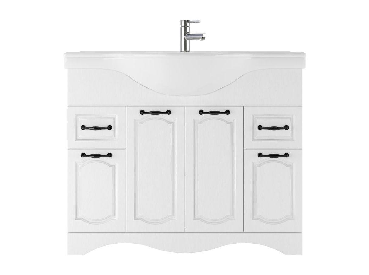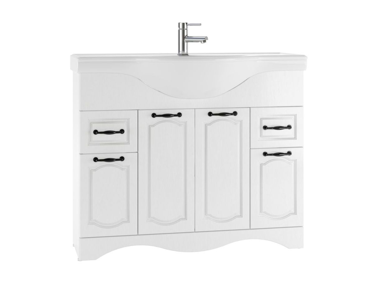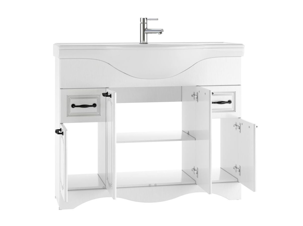 В напольной тумбе RICH 120 КЛАССИКА три выдвижных ящика и два отсека с дверцами, по середине которых – полка.