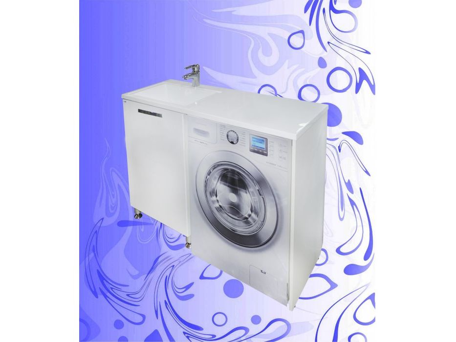 Стиральная машина, встроенная в мебель, смотрится более эстетично и аккуратно, сантехнические отводы будут скрыты за тумбой.