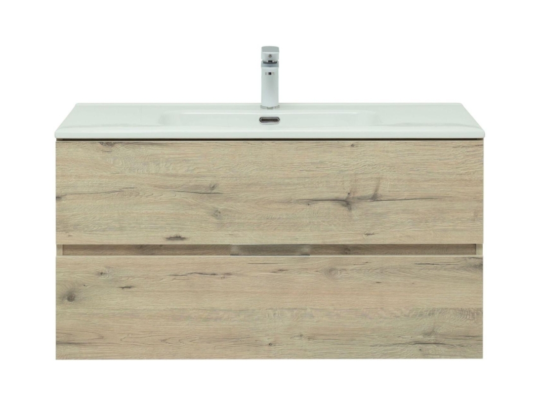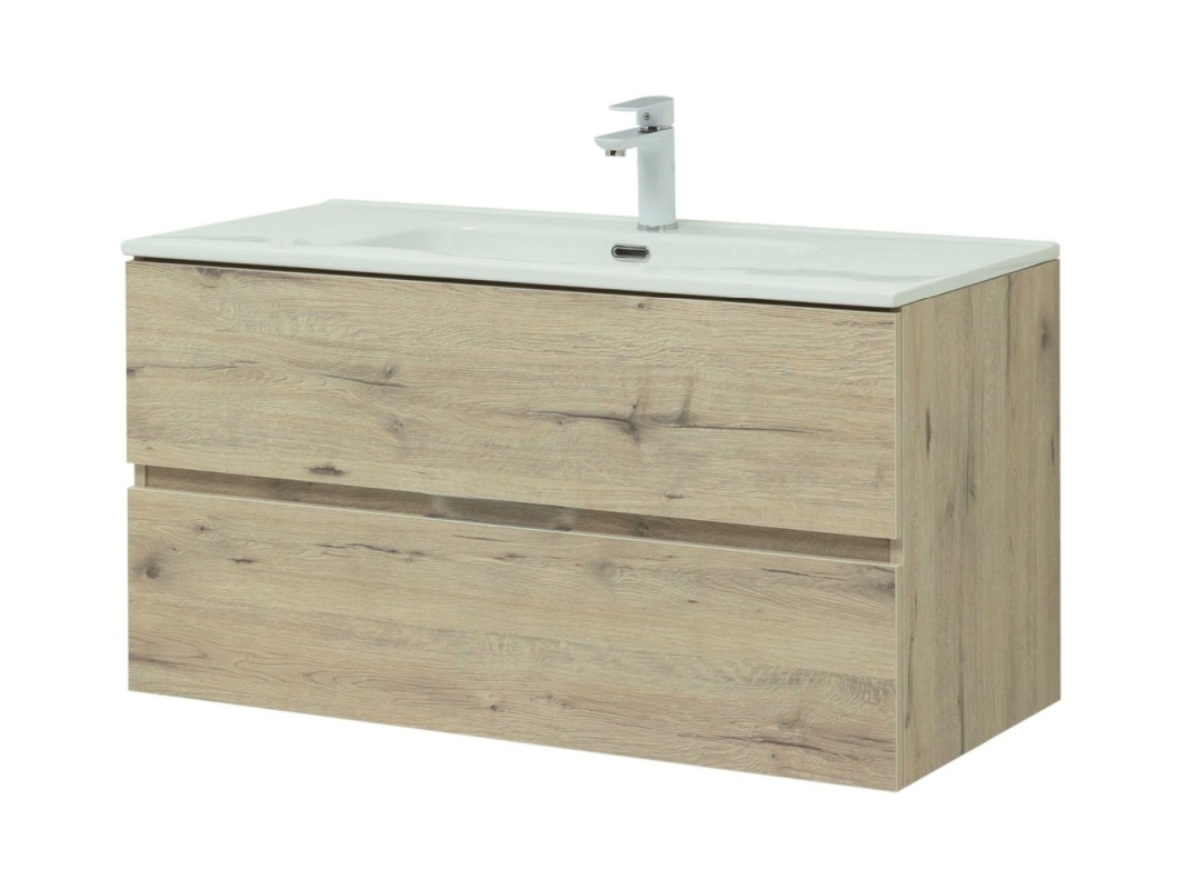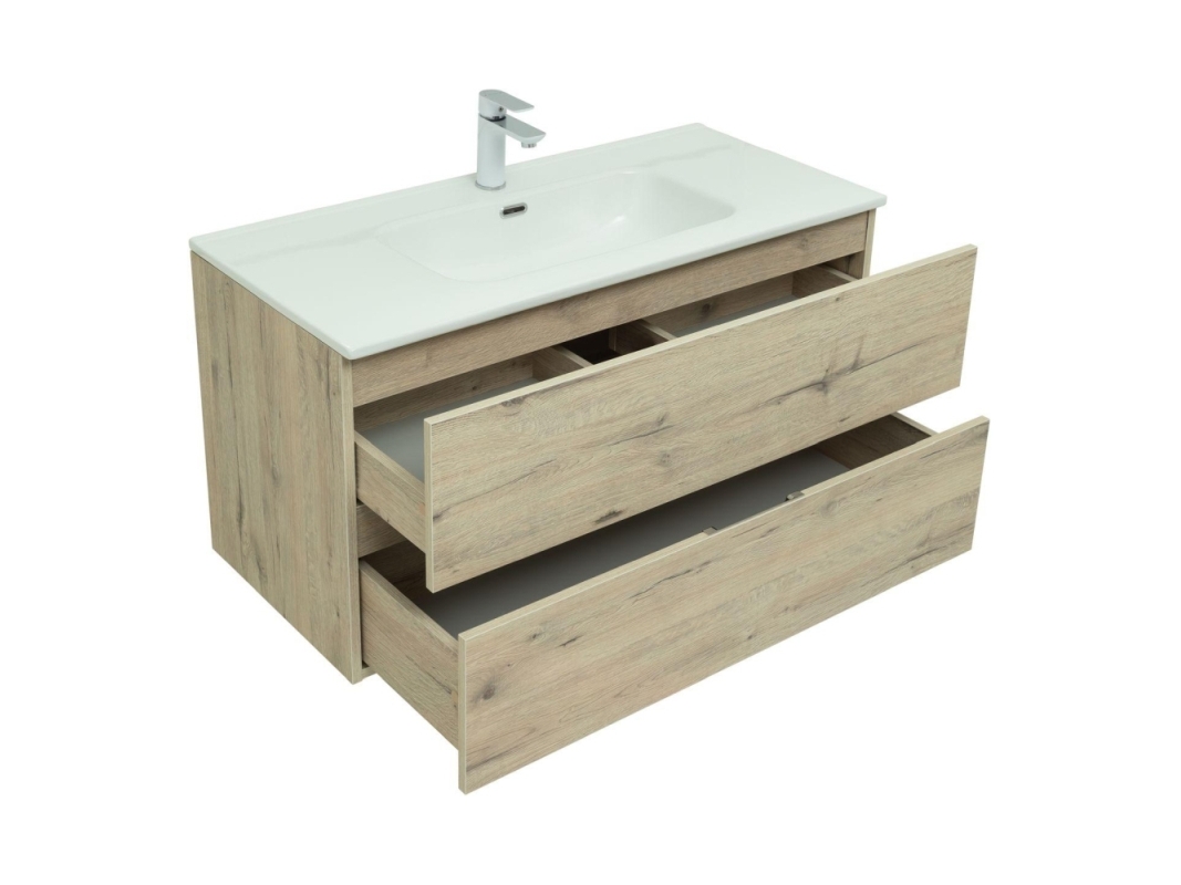 Тумба с раковиной Aquanet «Алвита» New 100 оснащена двумя широкими ящиками со скрытыми ручками, создающими безопасные условия эксплуатации. Внутри достаточно пространства для размещения всех необходимых принадлежностей — средств гигиены, бытовой химии, косметики. Корпус изготовлен из ЛДСП, устойчивой к воздействию влаги, и окрашен в цвет «дуб веллингтон белый». Тумбу крепят к стене, благодаря чему обеспечивается простота уборки пола под ней. Размеры — 1000х452х513 мм.
