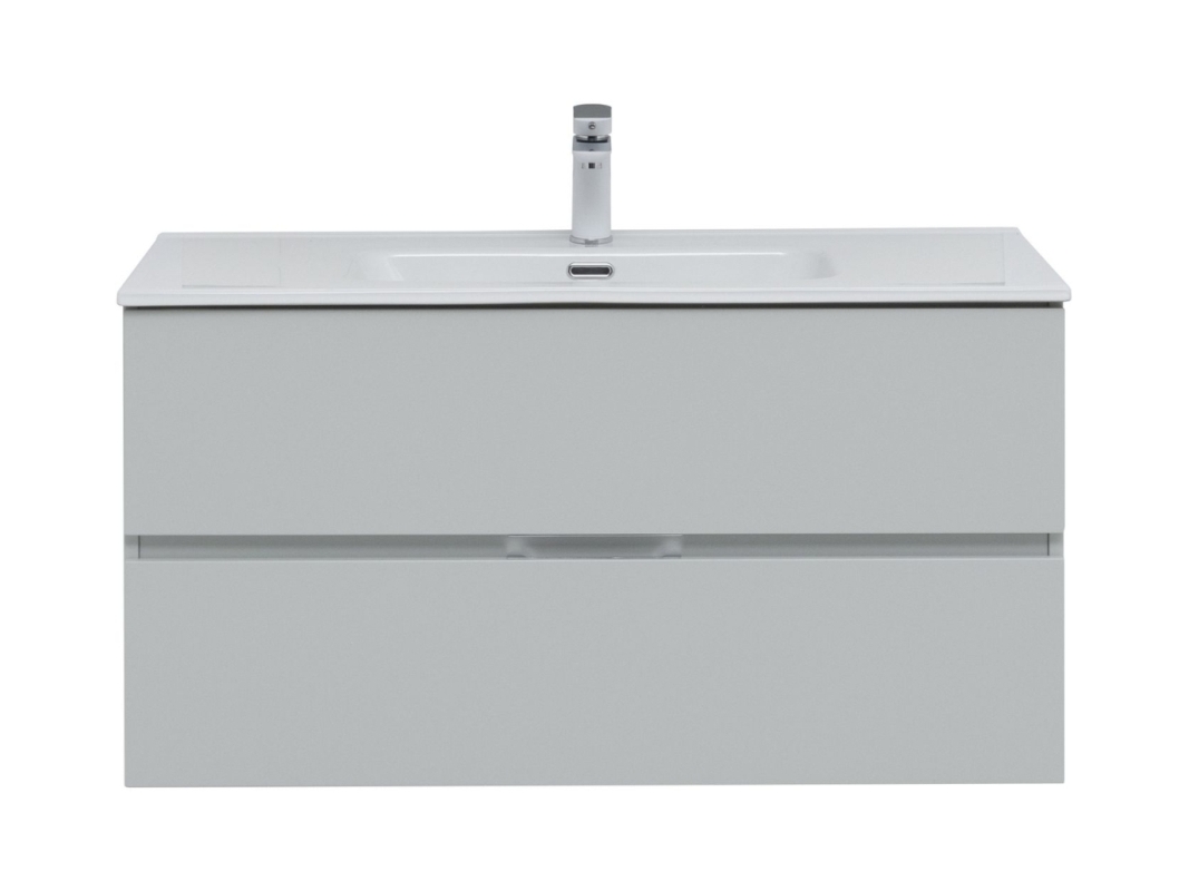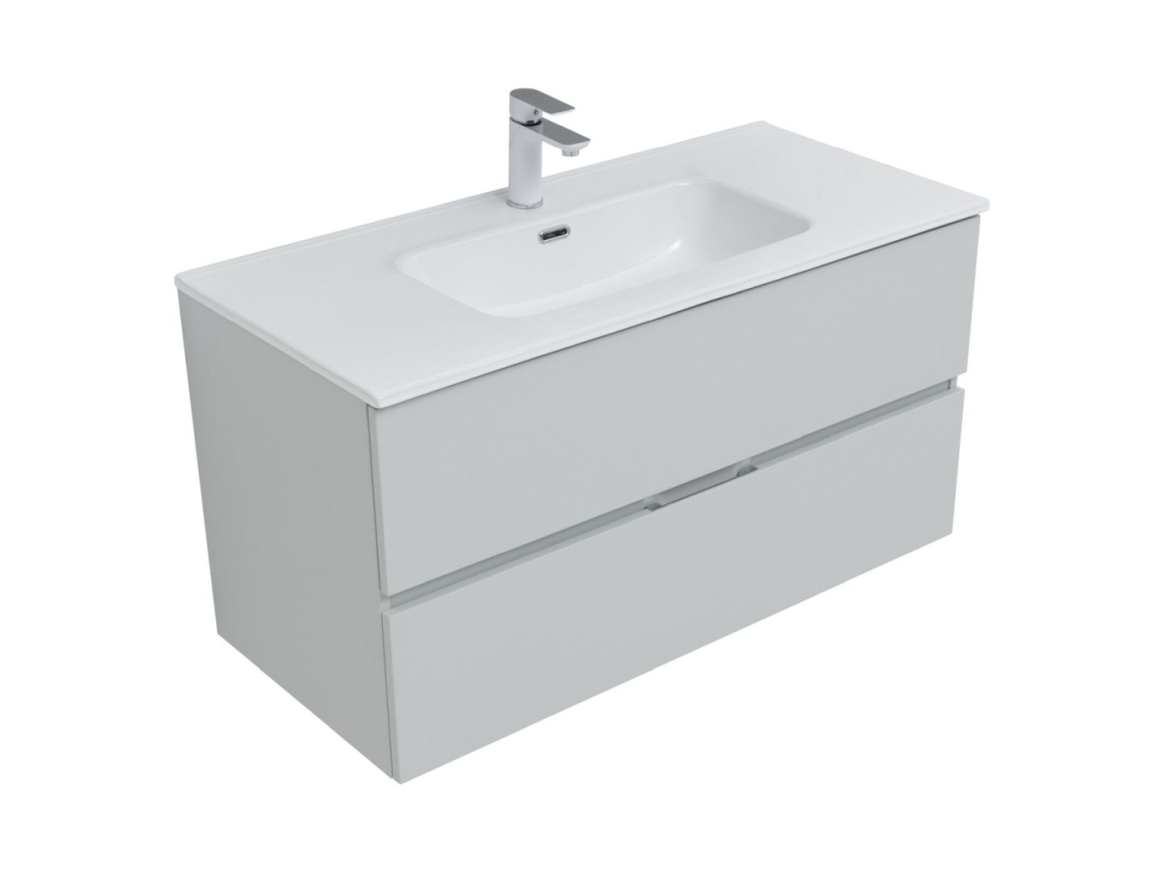 Сверху располагается раковина Aquanet Flat 100, изготовленная из долговечной и экологичной белоснежной керамики. Уход за поверхностью заключается в протирании влажной ветошью и неабразивными составами. Подготовленное отверстие на бортике позволяет провести быстрый монтаж смесителя. Размеры — 1010х465х175 мм.