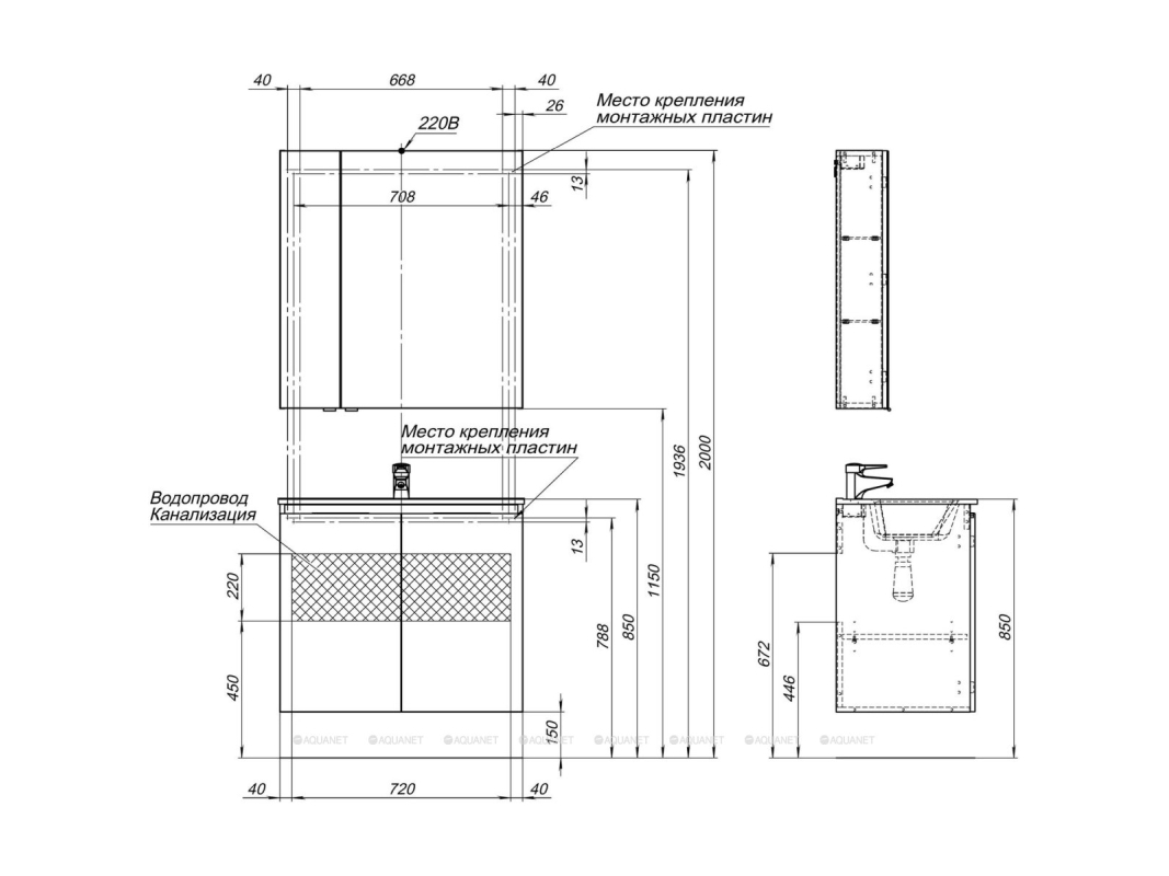 Для организации мест хранения подойдет пенал «Алвита» New 35 (артикул 00277560) и шкаф с зеркальной поверхностью «Алвита» New 80 (артикул 00277536) от производителя Aquanet. Для оснащения раковины рекомендуем приобрести смеситель (артикул 5.21001-00) и донный клапан (артикул 5.21026-31).