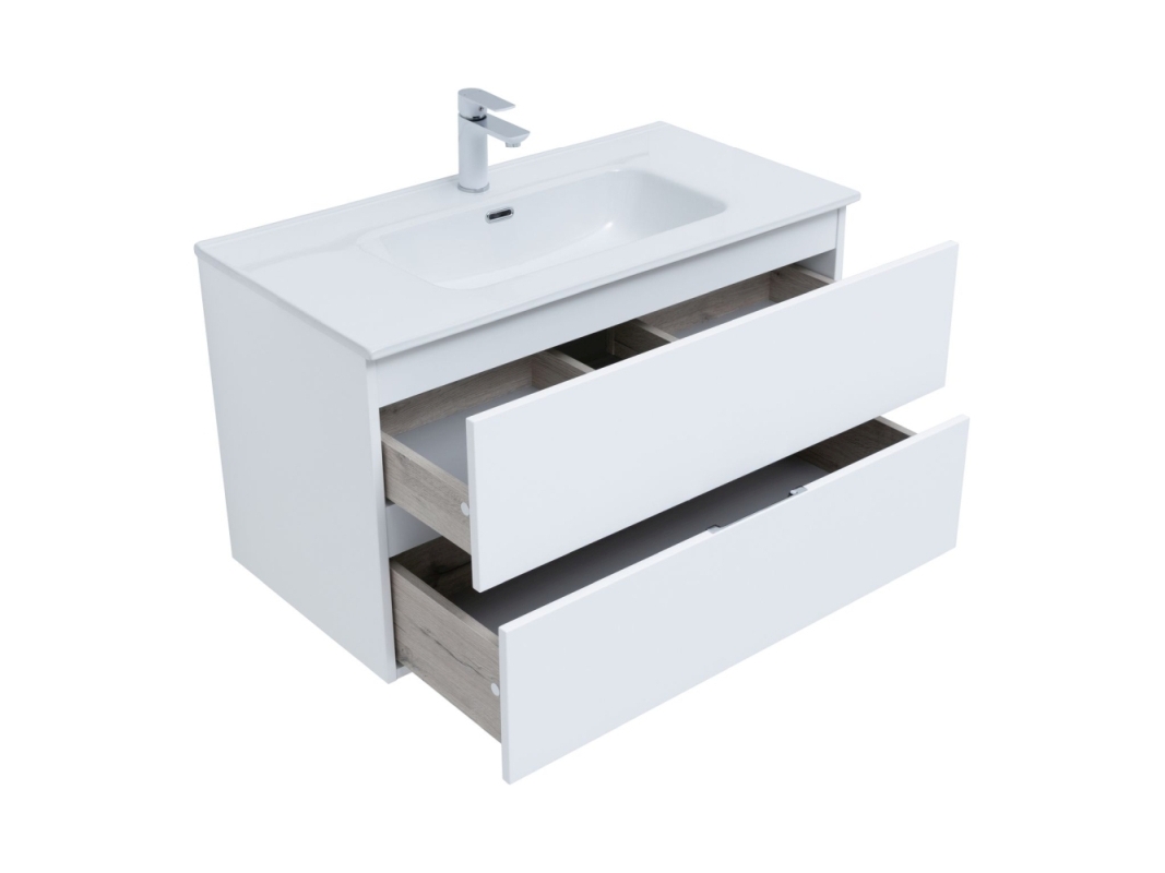 Сверху устанавливается прямоугольная раковина Aquanet Flat 90, изготовленная из керамики. Материал экологичный, гипоаллергенный и легко очищается от грязи неабразивными чистящими средствами.
