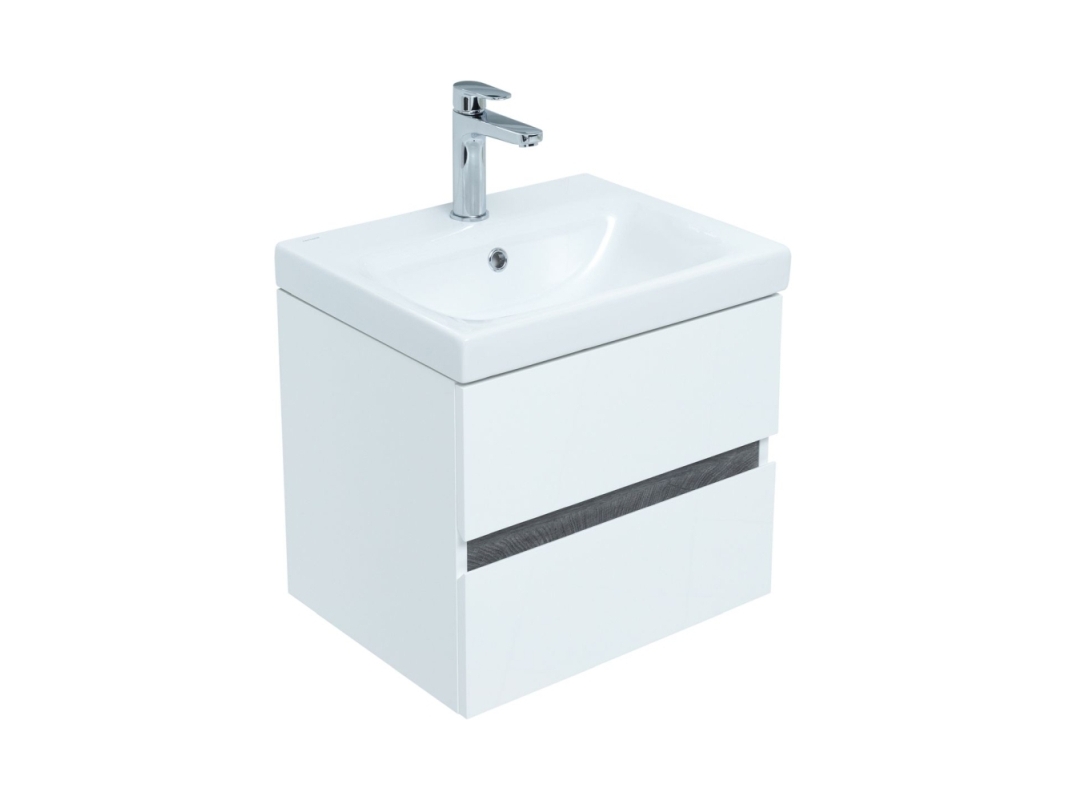 Тумба с раковиной Aquanet Беркли 50 белый/дуб рошелье имеет изюминку - контрастную декоративную полосу между ящиками в цвете «дуб рошелье». Корпус и фасады тумбы выполнены из влагостойкого ЛДСП и покрыты глянцевой белой эмалью. В конструкции тумбы использованы интегрированные ручки без острых краев и внутренних углов.