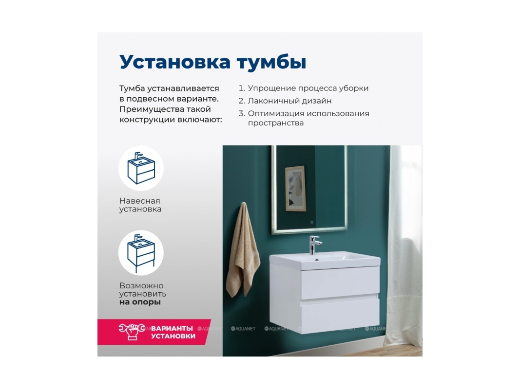 И еще одно важное преимущество: функциональная зона хранения в тумбе шириной 60 см. Она распределена между двумя выдвижными ящиками. Их внутренняя часть выполнена в белом цвете. Верхний ящик – это органайзер, разделенный на три отделения, где удобно хранить мелочи. Нижний более глубокий и позволит сложить полотенца или поставить весь арсенал пеномоющих или гигиенических средств. Ящики оборудованы доводчиками производства германской компании Hettich.