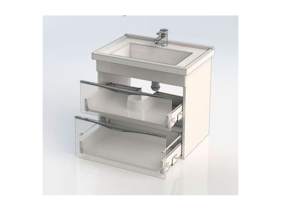 Тумба имеет вместительные выдвижные ящики и хромированные ручки нестандартной формы. Механизм доводчика обеспечивает плавное движение и закрытие ящиков. Широкая керамическая раковина производства известного бренда Sanovit располагается в виде столешницы.