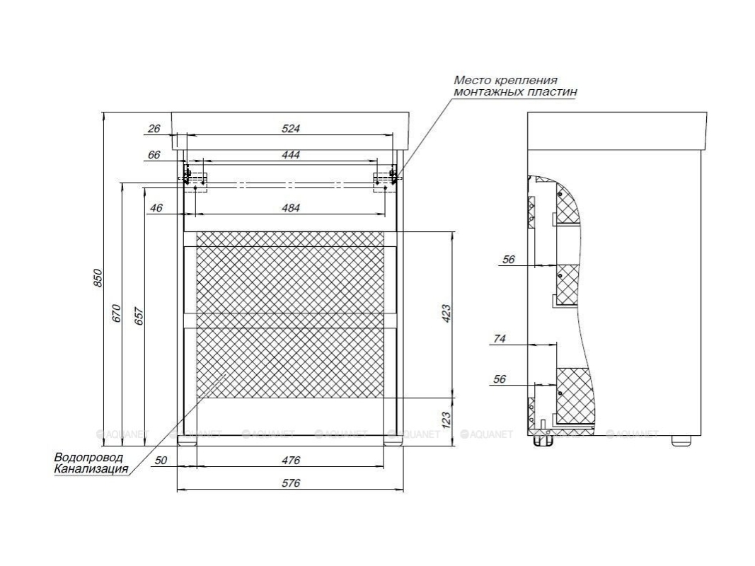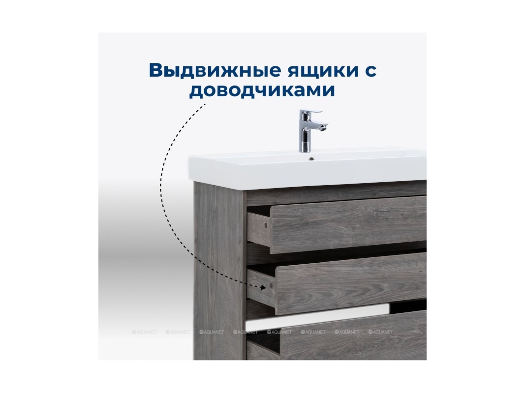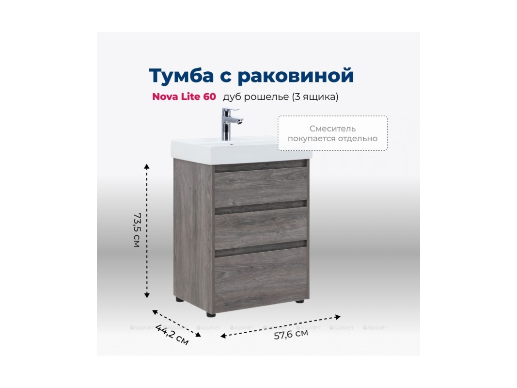 Тумба с раковиной Aquanet Nova Lite 60 в исполнении «дуб рошелье» — идеальный вариант для дополнения ванной комнаты в любом из современных стилей. Лаконичный дизайн с претензией на натуральность позволяет освежить санузел смелым решением. Компактные размеры 576*735*442 мм подойдут как для малых помещений, так и для просторных. Напольная модель оснащена ножками и тремя выдвижными шкафами. Пространство внутри организовано для хранения вещей и бытовой химии с учетом коммуникаций для водоотведения. Корпус и фасад мебели изготовлены из влагостойкого ЛДСП, который препятствует образованию плесени и грибка при длительном взаимодействии с водой и влажным воздухом. Выдвижные шкафы оснащены механизмом доведения, что обеспечивает плавное закрытие. В комплект к тумбе можно купить подходящую по размерам керамическую раковину от Aquanet, например модель «Латина», которая легко подсоединяется к мебели.