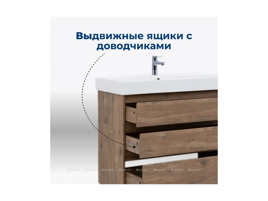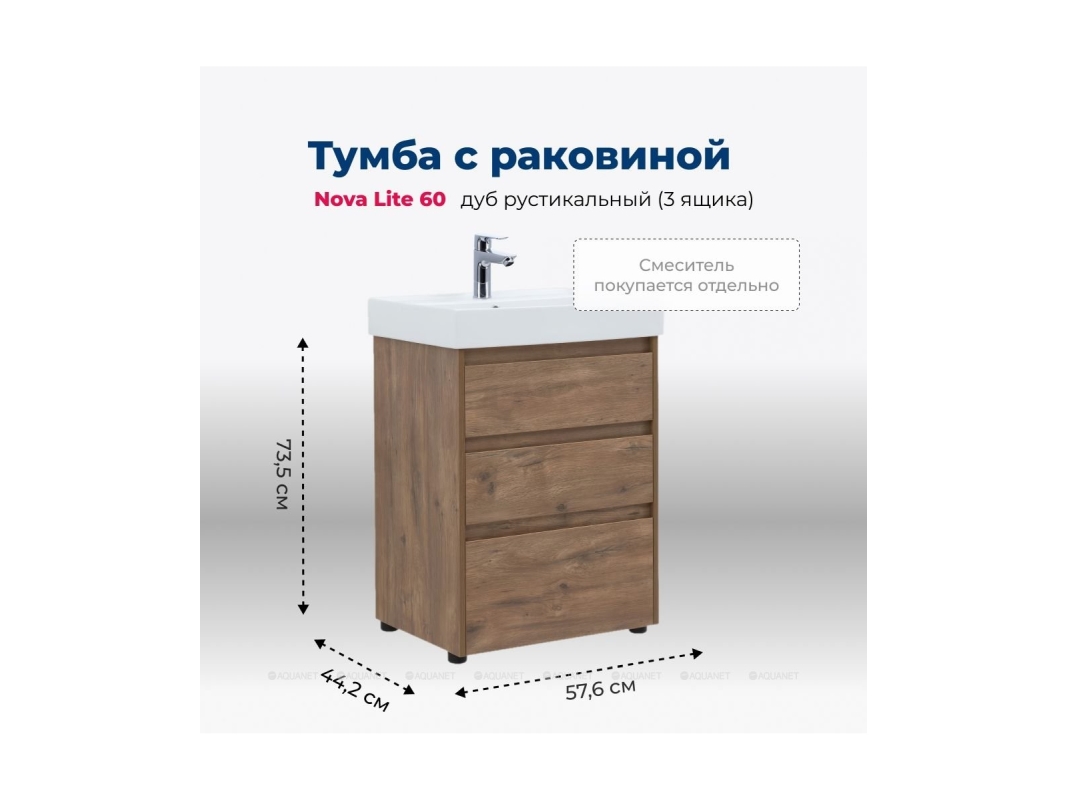 Тумба с раковиной Aquanet Nova Lite 60 в дубово-рустикальном исполнении — идеальный вариант для дополнения ванной комнаты в любом из современных стилей. Лаконичный дизайн с претензией на натуральность позволяет освежить санузел смелым решением. Компактные размеры 576*735*442 мм подойдут как для малых помещений, так и для просторных. Модель с ножками, напольная с тремя выдвижными шкафами. Пространство внутри организовано для хранения вещей и бытовой химии с учетом подведенных коммуникаций для водоотведения. Сам корпус и фасад мебели изготовлен из влагостойкого ЛДСП, который препятствует образованию плесени и грибка при длительном взаимодействии с водой и влажным воздухом. Выдвижные шкафы оснащены механизмом доведения, что обеспечивает плавное закрытие, даже при резком толчке. В комплект к тумбе можно купить подходящую по размерам керамическую раковину от Aquanet, например модель Латина, которая легко подсоединяется к мебели.