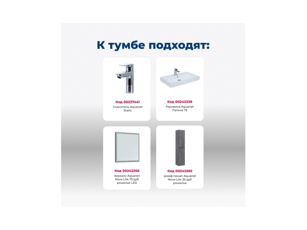 Тумба с раковиной Aquanet Nova Lite 75 из влагостойкой ламинированной древесно-стружечной плиты в благородном цвете «дуб рошелье» имеет достойный вид. Фактура натурального дерева выглядит изысканно, а подвесной монтаж придает визуальную легкость тумбе шириной 75 см. Она оборудована двумя выдвижными ящиками. Ящики довольно вместительные и позволяют разместить все необходимое. Фасады выполнены с декоративной интегрированной ручкой, не имеющей острых краев и внутренних углов, что обеспечивает удобство в эксплуатации и легкий уход за мебелью. Ящики комплектуются направляющими немецкого производства Hettich Quadro, оснащенными доводчиками. Неглубокая и стильная керамическая раковина «Латина» идеально подходит к тумбе.